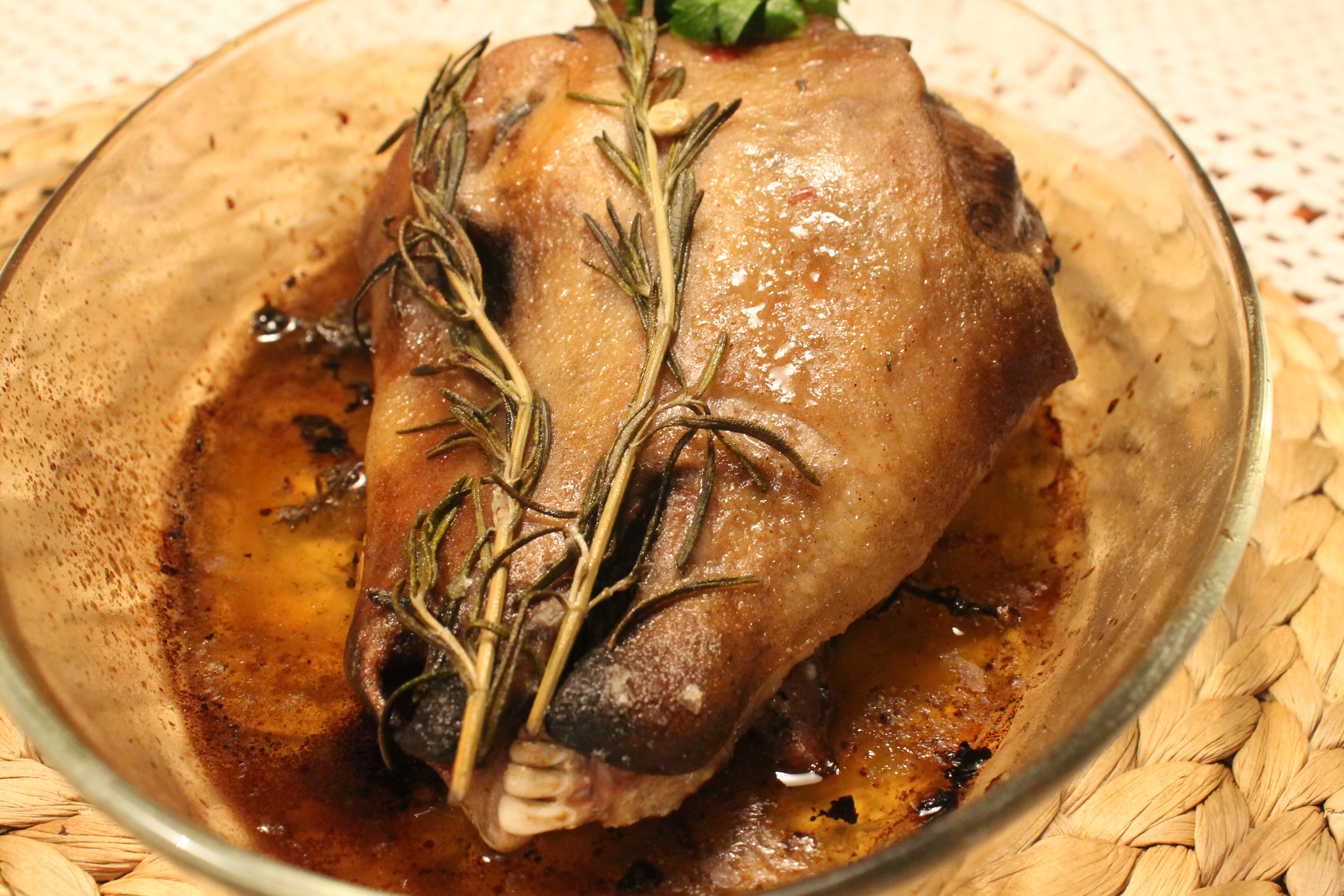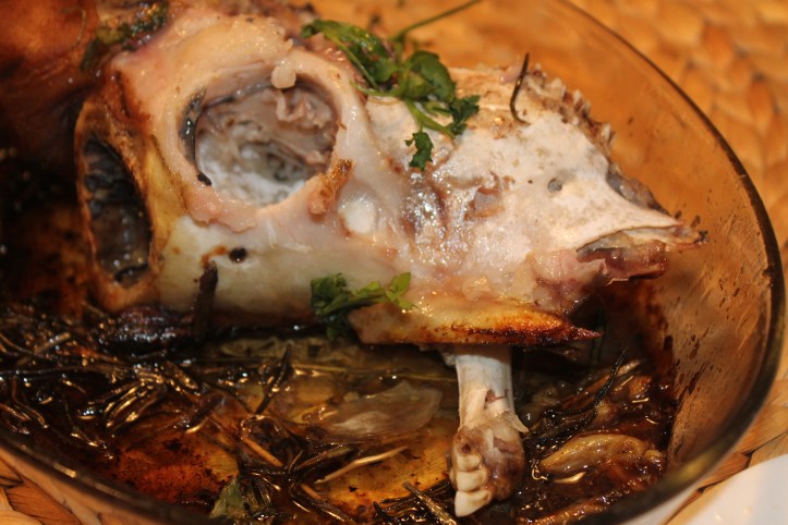 Svo tók ég lítið, eldfast fat, hellti ögn af ólífuolíu í það, setti smávegis rósmarín og timjan á botninn ásamt tveimur krömdum hvítlauksgeirum, pipar og salti, lagði frosinn kjammann ofan á, bar svolitla ólífuolíu á hann, kreisti sítrónusafa yfir, kryddaði með pipar og salti og lagði tvær rósmaríngreinar ofan á af því að ég átti þær til (en reyndar fannst mér rósmarínið litlu skila í bragði, það má vel sleppa þeim). Breiddi svo álpappírsörk vel yfir mótið og setti það í ofninn.