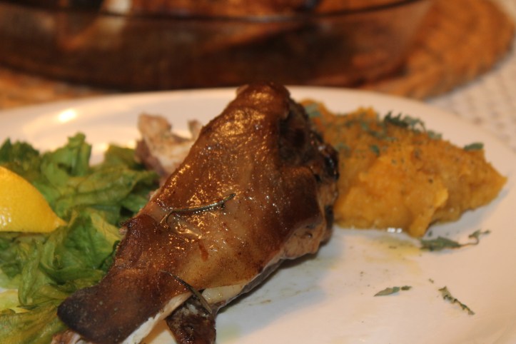 Á meðan sauð ég sæta kartöflu og stappaði hana svo með ögn af ólífuolíu (má líka vera smjör). Kryddaði hana svo með dálitlu kummini, pipar, salti og muldum þurrkuðum basilíkublöðum og bar hana fram með sviðakjammanum, ásamt salati og sítrónubát.