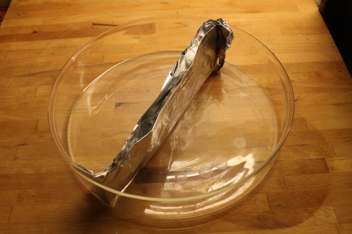 Það er best að nota skál með flötum botni ef maður ætlar að gera tvílitan búðing, samt ekkert bráðnauðsynlegt. Ég hef stundum notað pappaspjald en fann ekkert hentugt núna svo ég tók bara álpappírsbút, braut hann saman tvisvar eða þrisvar og kom honum fyrir í skálinni þannig að hann skipti henni í tvennt.