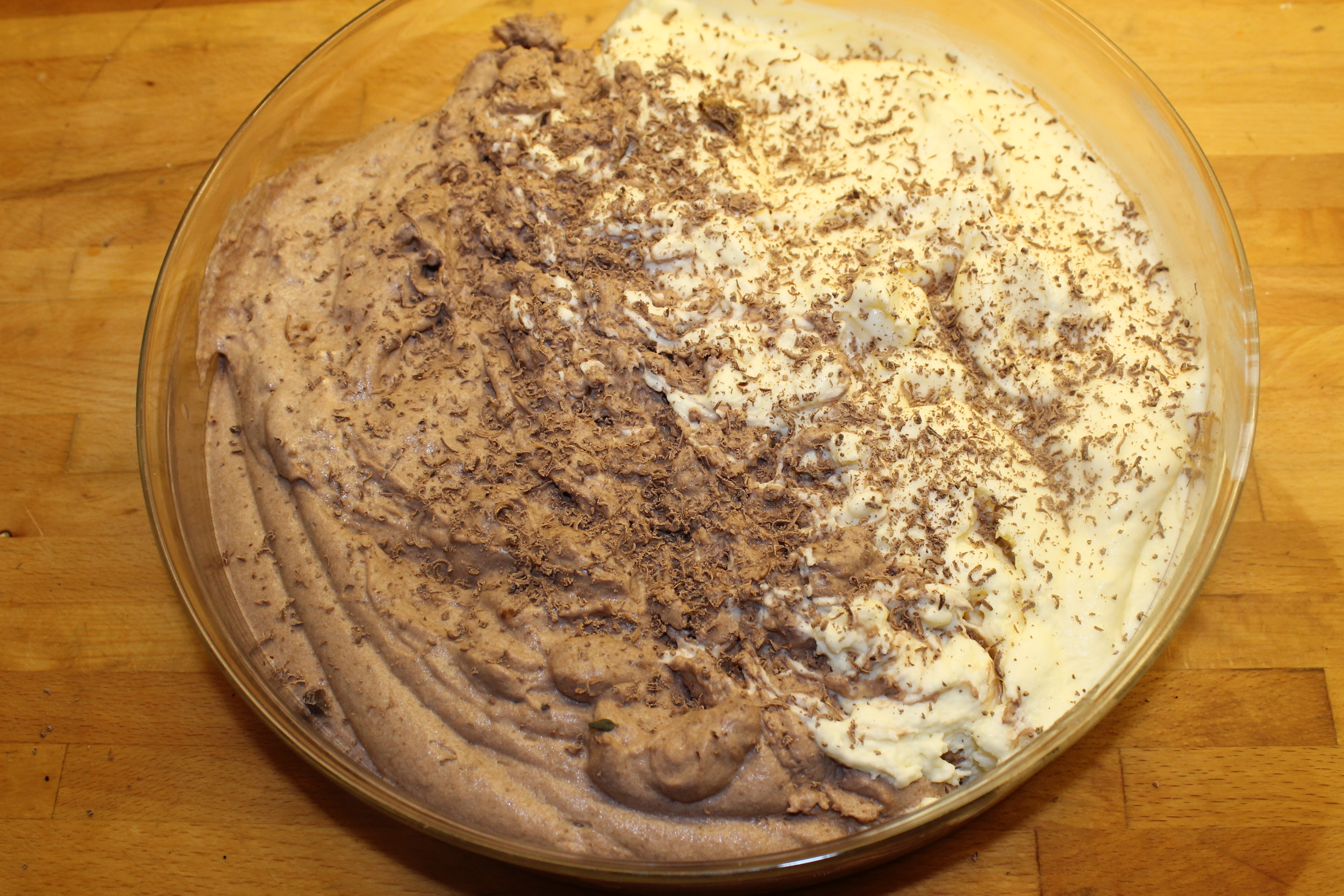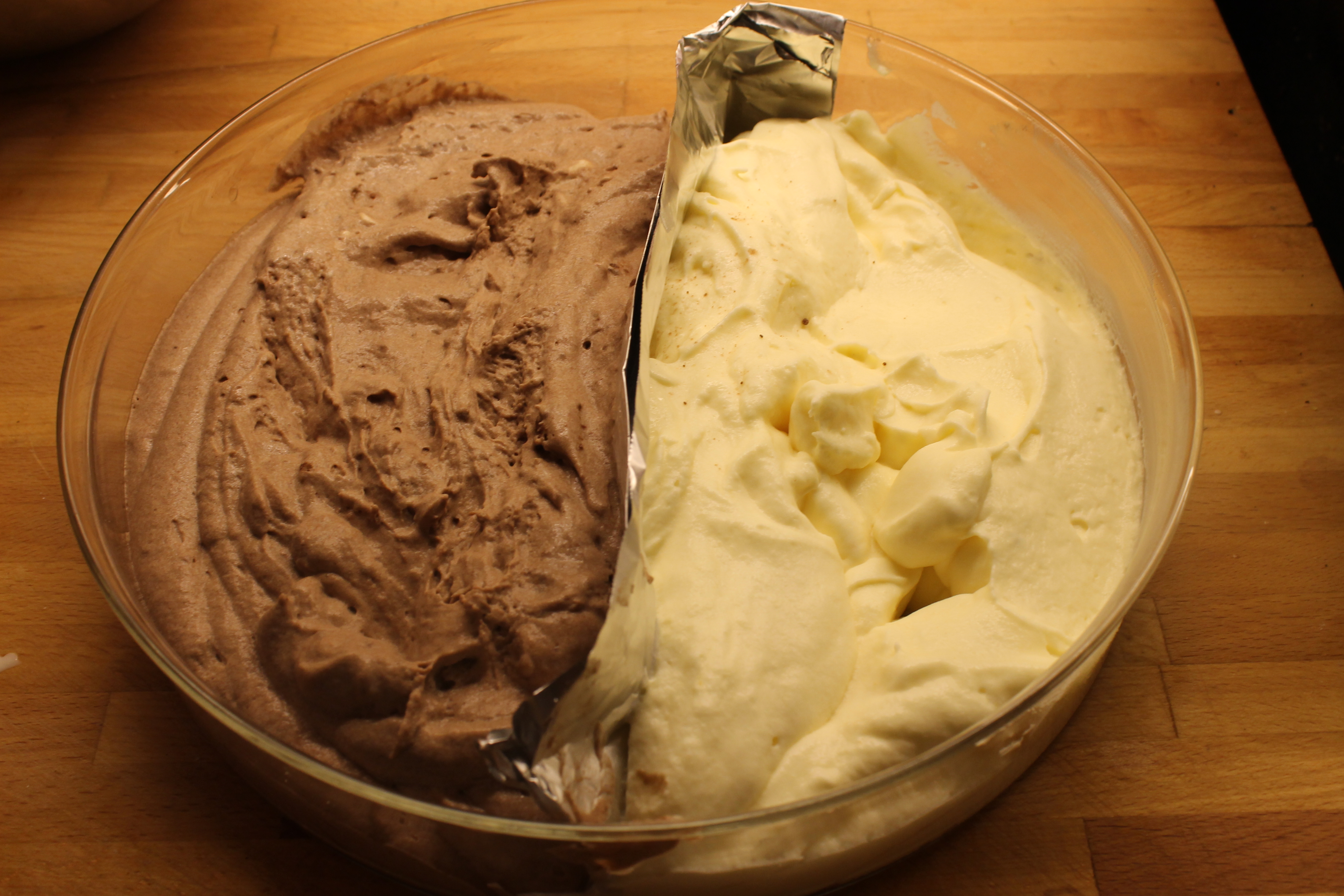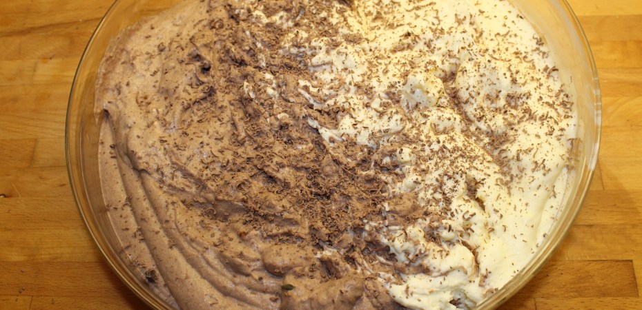 Royal-búðingur er fljótur að stífna en þegar maður gerir hann a) með rjómablandi og b) notar 20% minna magn af vökva en stendur í leiðbeiningunum, þá er hann mjög fljótur að stífna. Þess vegna opnaði ég báða búðingspakkana til að hafa þá tilbúna, hellti vanillubúðingsduftinu út í aðra skálina, þeytti með handþeytara í svona hálfa mínútur, hellti búðingnum í skálina öðru megin við skilrúmið, þeytti svo súkkulaðibúðinginn (betra að byrja á vanillubúðingnum til að þurfa ekki að skola þeytarana) og hellti honum í hinn helming skálarinnar.