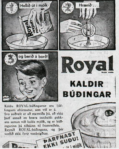 Royal-búðingar hafa líklega verið fluttir inn allt frá 1941 en farið var að framleiða þá hérlendis um miðjan sjötta áratuginn – þessi auglýsing er frá 1956: