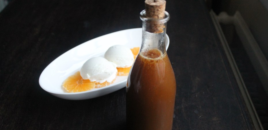 Það mætti líka alveg hræra dálitlu súkkulaði saman við og láta það bráðna í sósunni en þá er best að láta hana kólna örlítið fyrst. Svo þegar hún var orðin hálfköld hellti ég henni í flösku (eða krukku). En það má auðvitað líka bera hana fram heita.