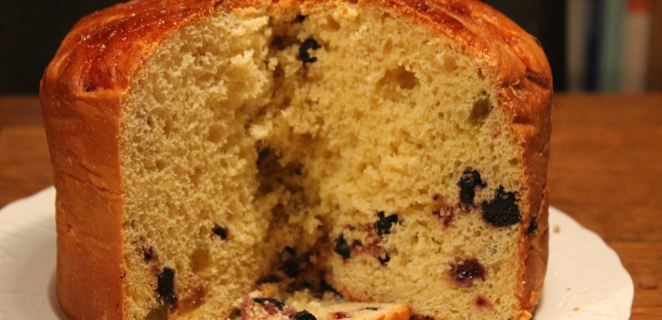 En ég hef oftastnær haft panettone á jólunum, mörg undanfarin ár, reyndar – var ég að átta mig á – aðallega til að eiga afgang til að búa til brauðbúðing eftir jólin; ég hef aldrei verið yfir mig hrifin af þessu verksmiðjupanettone en brauðbúðingarnir sem ég bý til úr því hafa verið alveg eðal … Ég var að hugsa um að kaupa mér panettone núna en ofbauð verðið, svo ég ákvað að baka sjálf. En nennti ekki veseni. Hef nokkrum sinnum bakað panettone – mis-vesenismikið – en ekki verið nógu ánægð með árangurinn. Svo ég fór að skoða uppskriftir, athugaði Dan Lepard, Mario Batali, Carluccio, nokkra aðra, og sló þessu svo eitthvað saman, stytti mér leið … og var bara nokkuð ánægð með árangurinn. Kakan lyfti sér vel og fallega; hún er ekki eins mjúk og flöffí og þessar verksmiðjuframleiddu en það finnst mér reyndar bara kostur. Og bragðið var betra. Þetta brauð geymist ekki vikum eða mánuðum saman og það er best að baka það rétt fyrir jól. Og nota svo afganga, ef einhverjir verða, í brauðbúðing eða eitthvað ámóta.