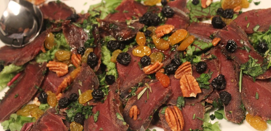 Svo setti ég hrúgu af salatblöðum á fat, raðaði gæsabringusneiðum ofan á, dreifði nokkrum matskeiðum af þurrkuðum bláberjum og gullnum rúsínum yfir (mættu líka vera önnur þurrkuð ber/ávextir, t.d. trönuber, saxaðar apríkósur eða gráfíkjur o.fl.) og grófmuldi nokkrar pekanhnetur yfir. Að lokum dreypti ég svolitlu af vinaigrettunni yfir og bar afganginn fram með.