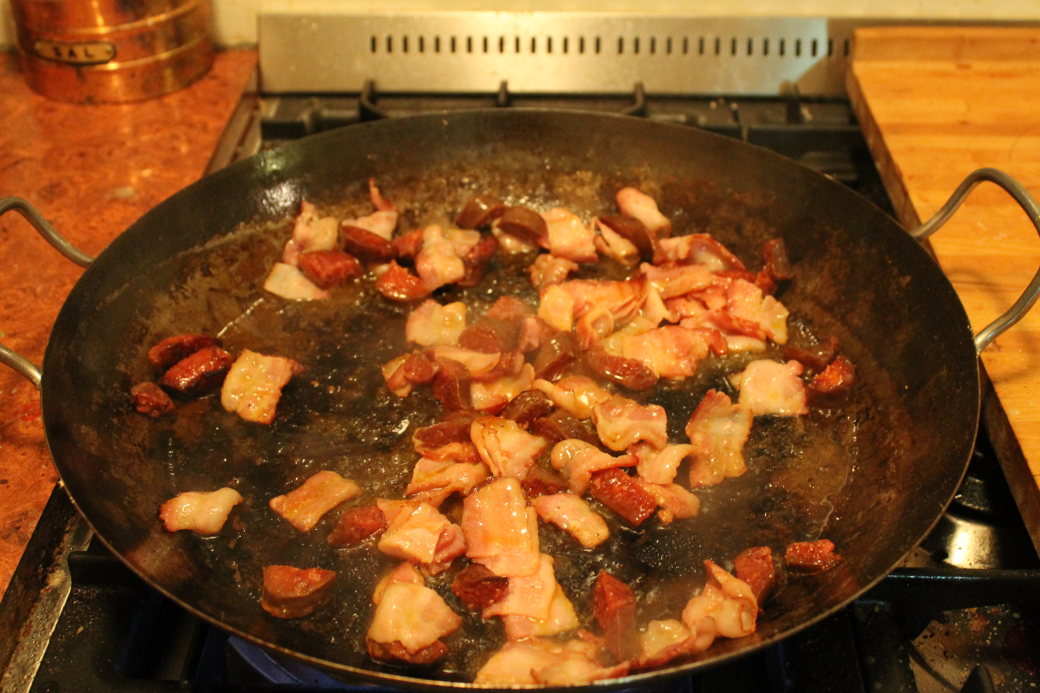 Ég byrjaði á að setja paellupönnuna á eldavélina, hita 4 msk af ólífuolíu og skera niður svona 150 g af beikoni og 200 g af chorizo-pylsu og steikja við góðan hita í nokkrar mínútur við góðan hita.