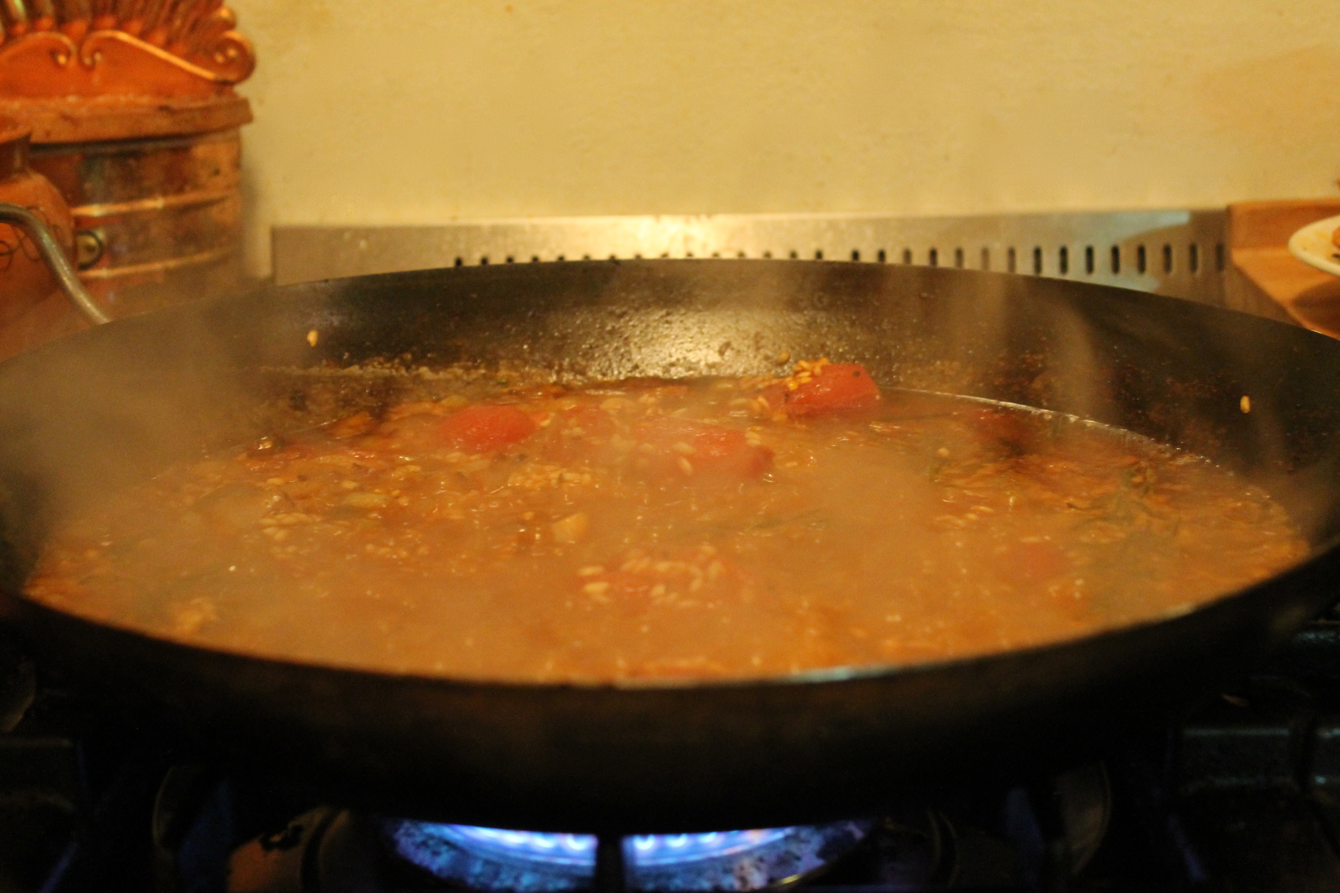 Á meðan þetta brúnaðist hafði ég skorið niður tvo lauka og saxað 3-4 hvítlauksgeira smátt. Setti þetta á pönnuna og steikti í sömu feitinni við fremur vægan hita í nokkrar mínútur. Þegar laukurinn var aðeins farinn að taka lit hellti ég innihaldinu úr einni dós af tómötum á pönnuna, kramdi tómatana dálítið í sundur með spaða, setti 2-3 rósmaríngreinar og álíka af timjani á pönnuna (má líka nota þurrkaðar jurtir) og lét þetta malla við hægan hita þar til tómatsafinn var að mestu gufaður upp. Þetta er bragðgrunnurinn fyrir paelluna og kallast sofrito.