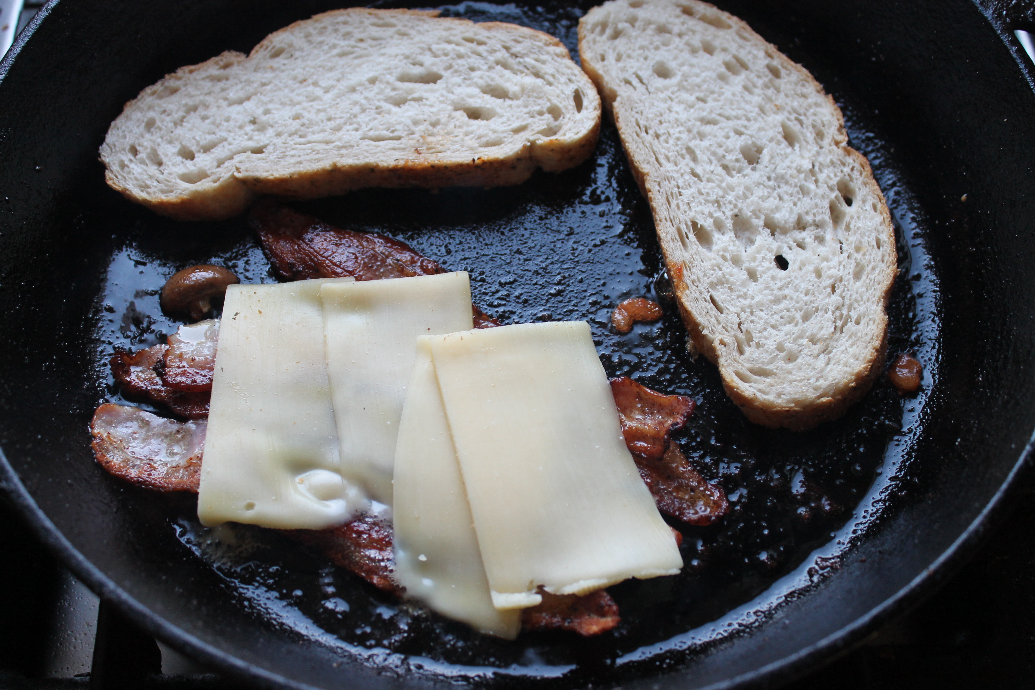 Beikonsneiðunum sneri ég aftur á móti við (í einu lagi) þegar þær voru orðnar stökkar á annarri hliðinni og setti um leið fjórar ostsneiðar ofan á og lét ostinn bráðna. Svo tók ég tómatana, sveppina og pylsusneiðarnar af pönnunni og setti á disk (hafði eldhúspappír á diskinum til að láta renna af þessu) en setti brauðsneiðarnar á pönnuna og steikti þær á báðum hliðum.