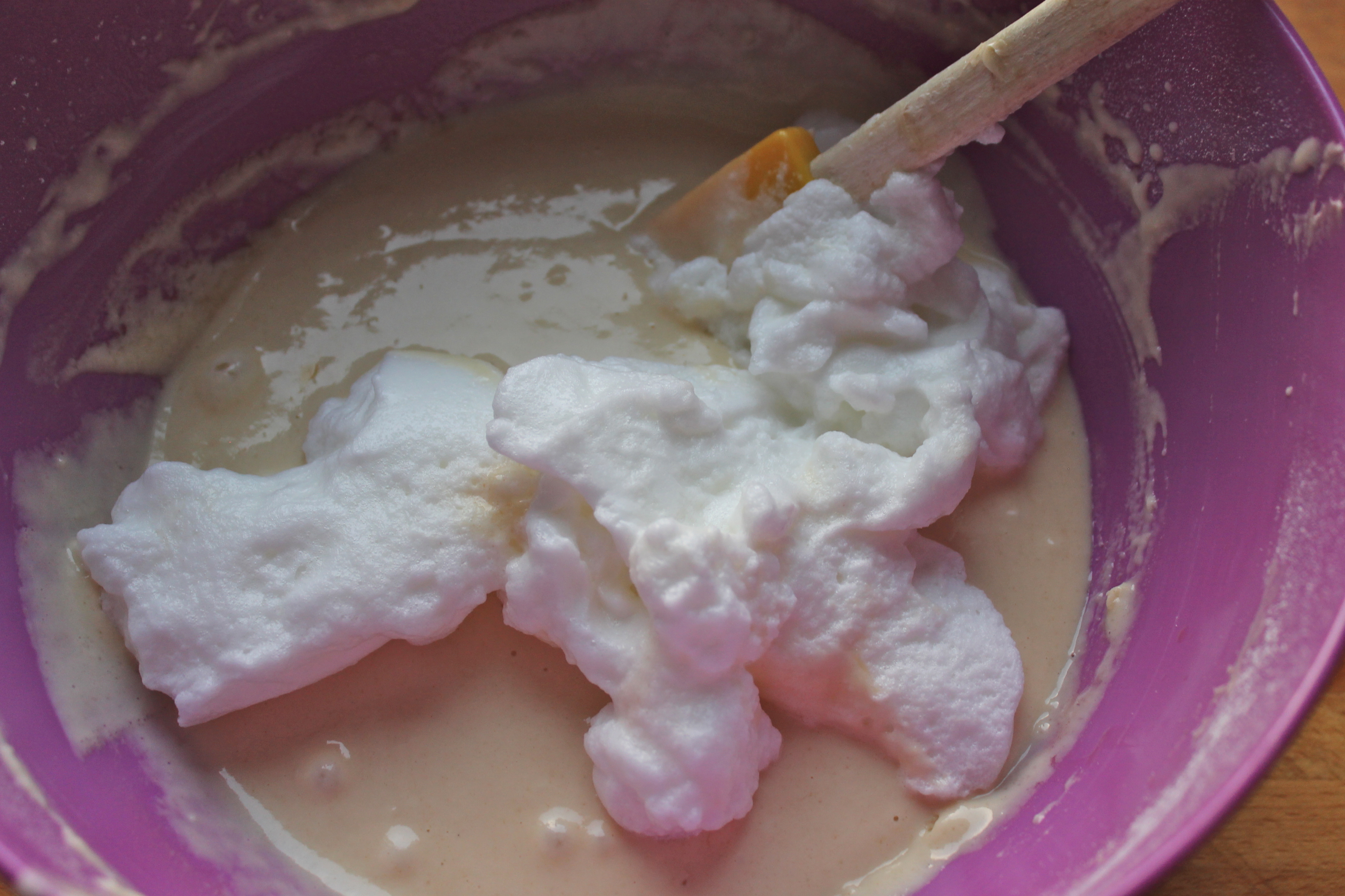 Ég byrjaði á að bræða 60 g af smjöri og láta það svo kólna dálítið. Svo velgdi ég 250 ml af mjólk (ég notaði léttmjólk). Hellti um 50 ml í skál og stráði 1 tsk af þurrgeri yfir og lét standa á meðan ég aðskildi eitt stórt egg og þeytti hvítuna þar til hún myndaði stífa toppa.