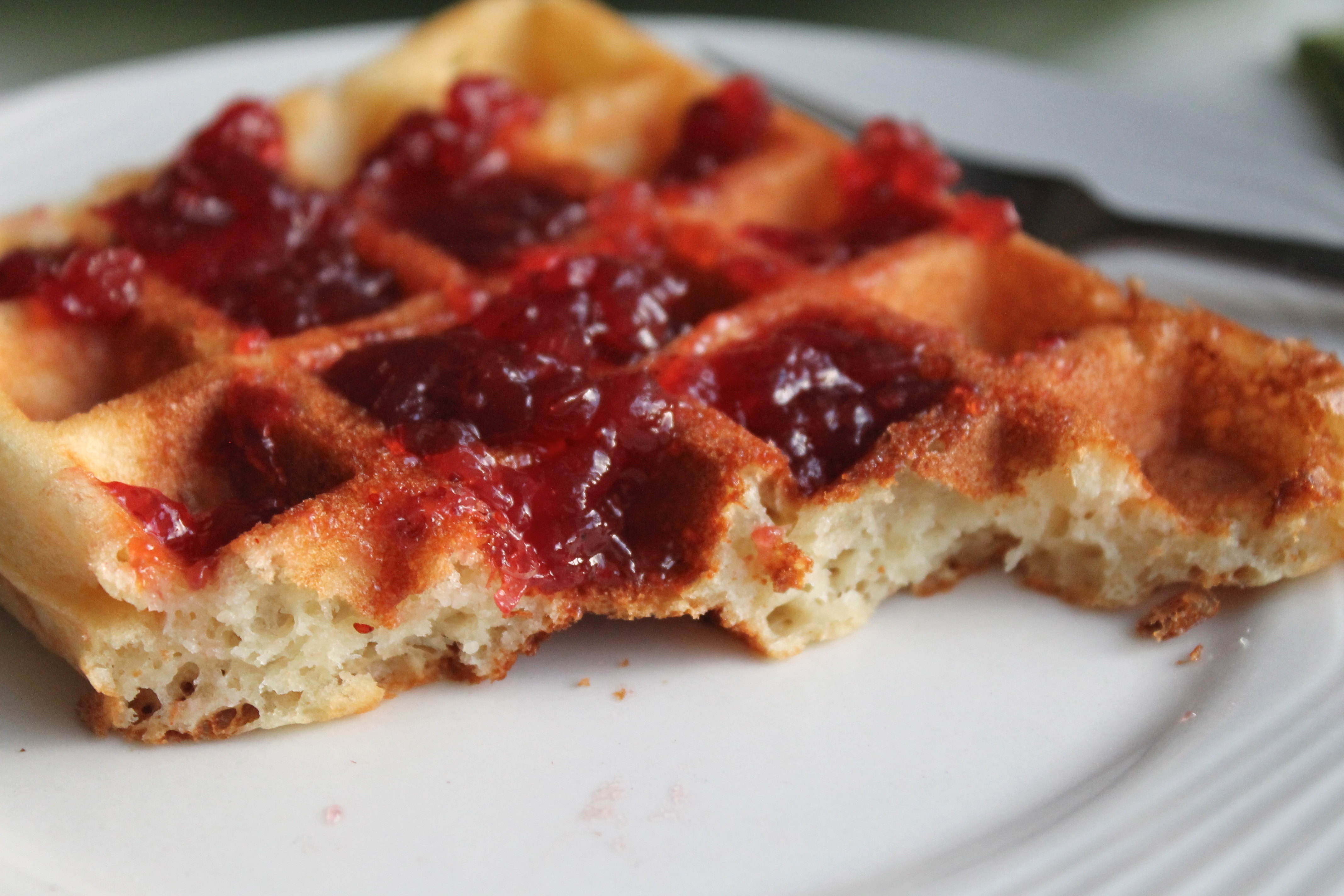 Ég hafði nú bara sænska títuberjasultu með vöfflunum en það má hafa alls konar sultur og ber, rjóma, ís, súkkulaðisósu, Nutella, smjör, hlynsíróp … og svo náttúrlega kjúkling. En ég ákvað að láta það eiga sig í þetta skipti, þótt ég ætti reyndar djúpsteikta kjúklingaleggi …