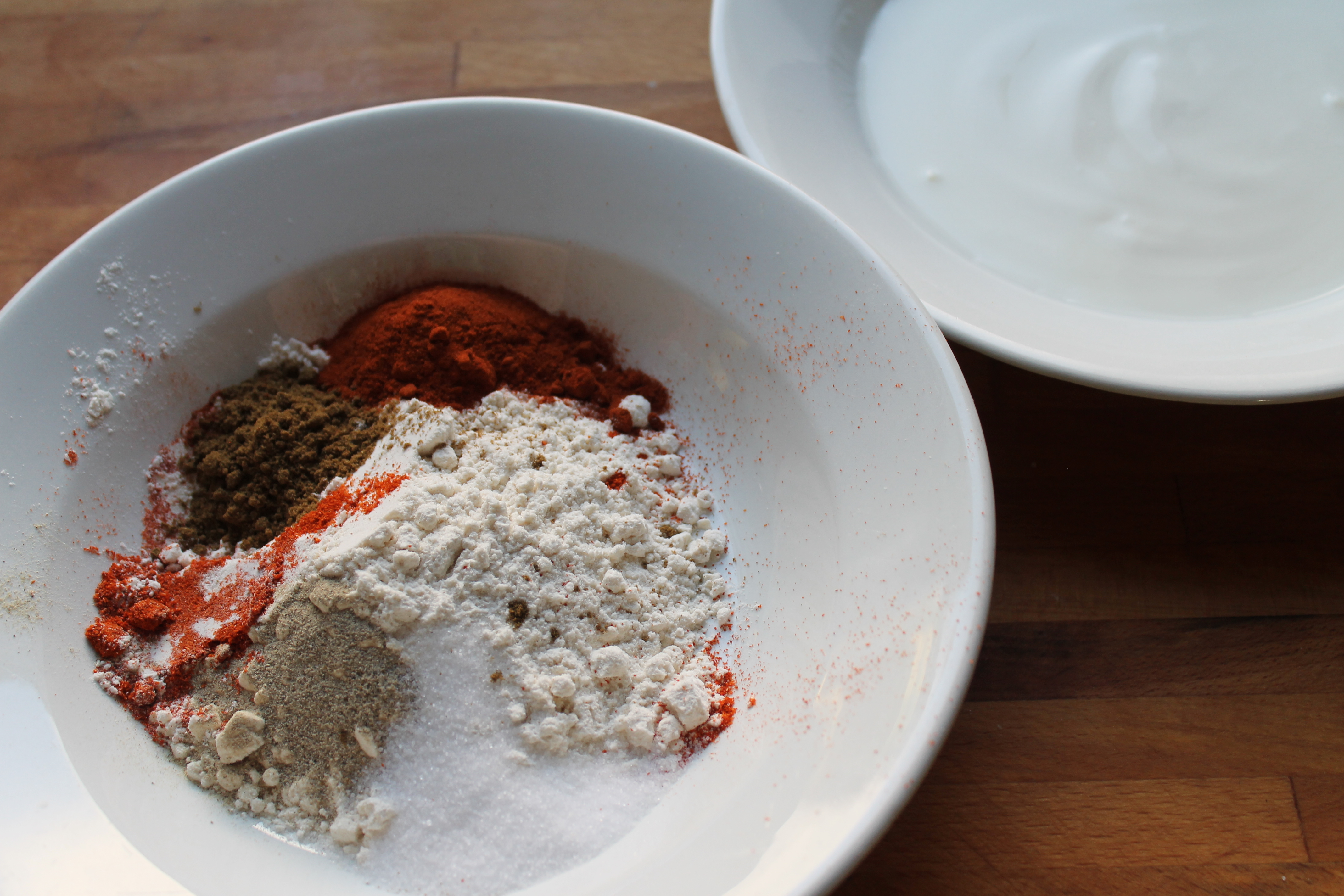 En ég byrjaði á að hella slatta af AB-mjólk (eða súrmjólk eða jógúrt) á djúpan disk. Magnið skiptir ekki máli, þetta er bara til að velta kjúklingaleggjunum upp úr. Á annan disk setti ég svo 100 g af hveiti, 1/2 tsk af pipar, 1 tsk af salti, 1 1/2 tsk af paprikudufti, 1 tsk af kummini (má sleppa) og ögn af cayenne-pipar og blandaði vel saman.