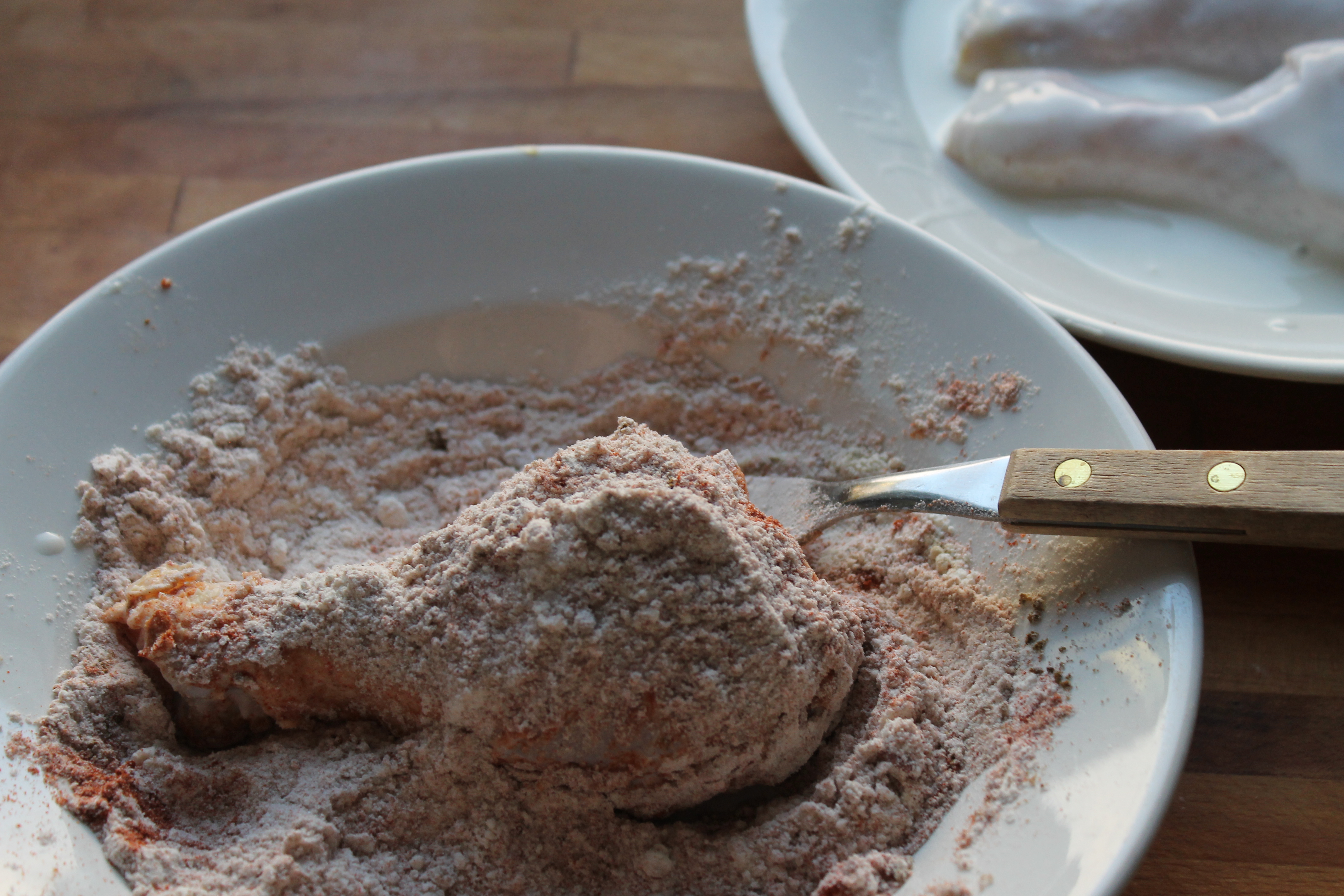 Svo velti ég kjúklingaleggjunum – þeir voru átta alls – upp úr AB-mjólkinni og síðan upp úr hveitikryddblöndunni. Eða öllu heldur, ég setti þá á hveitidiskinn og jós yfir þá því ég vildi reyna að láta sem allra mest af hveitinu tolla á þeim. – Best er að bitarnir séu ekki kaldir beint úr ísskápnum, heldur hafi staðið nokkra stund á eldhúsbekknum.