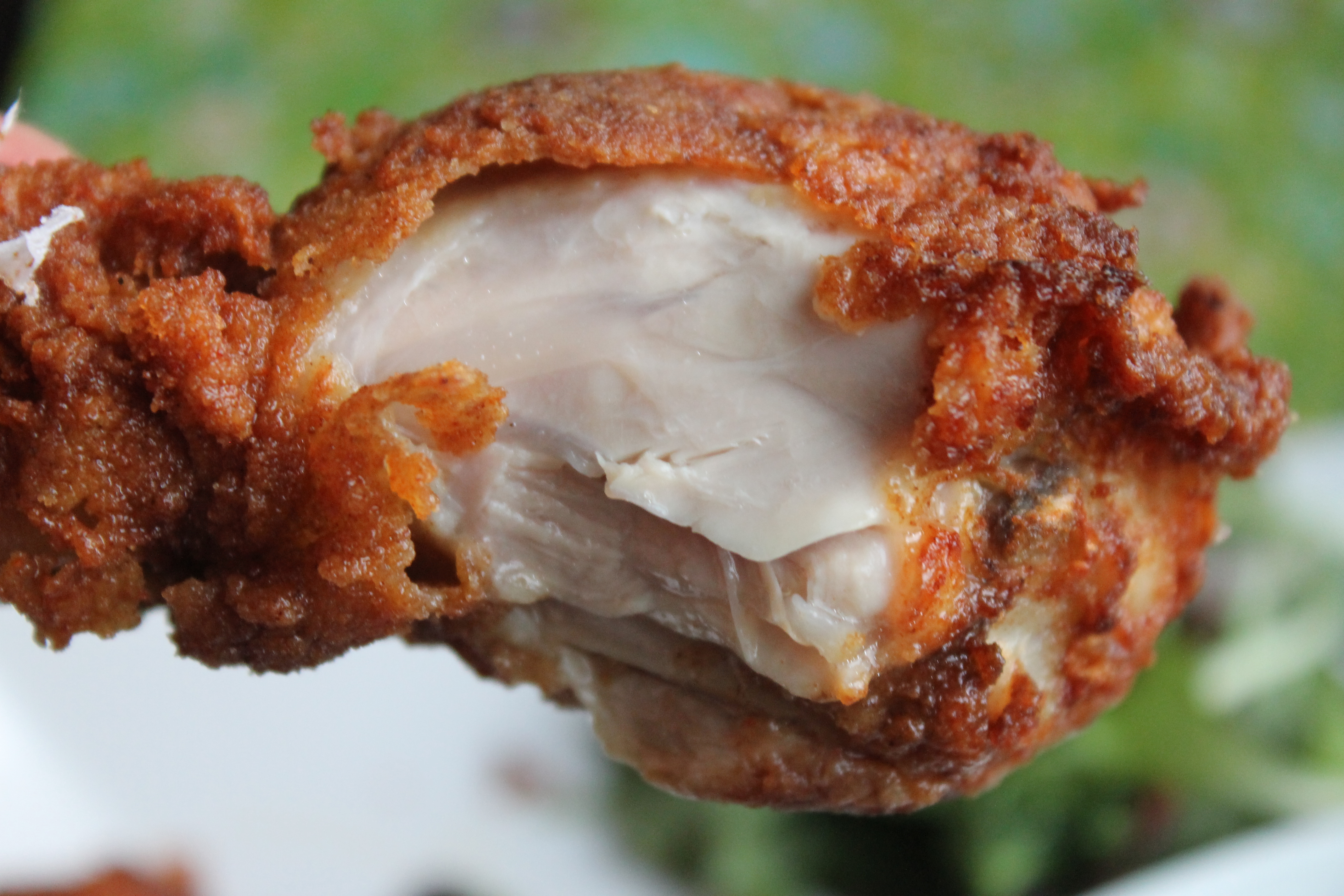 Ég hitaði olíuna í svona 190-200°C – ef maður á ekki hitamæli má til dæmis setja brauðmola út í og ef feitin bullsýður í kringum hann er hún nógu heit. Þá setti ég kjúklingaleggina gætilega út í og svo lækkaði ég hitann töluvert – ekki alveg á minnsta loga en næstum því … Olían þarf að sjóða en má ekki hitna of mikið, þetta verður hver að finna út fyrir sig á sinni vél.
