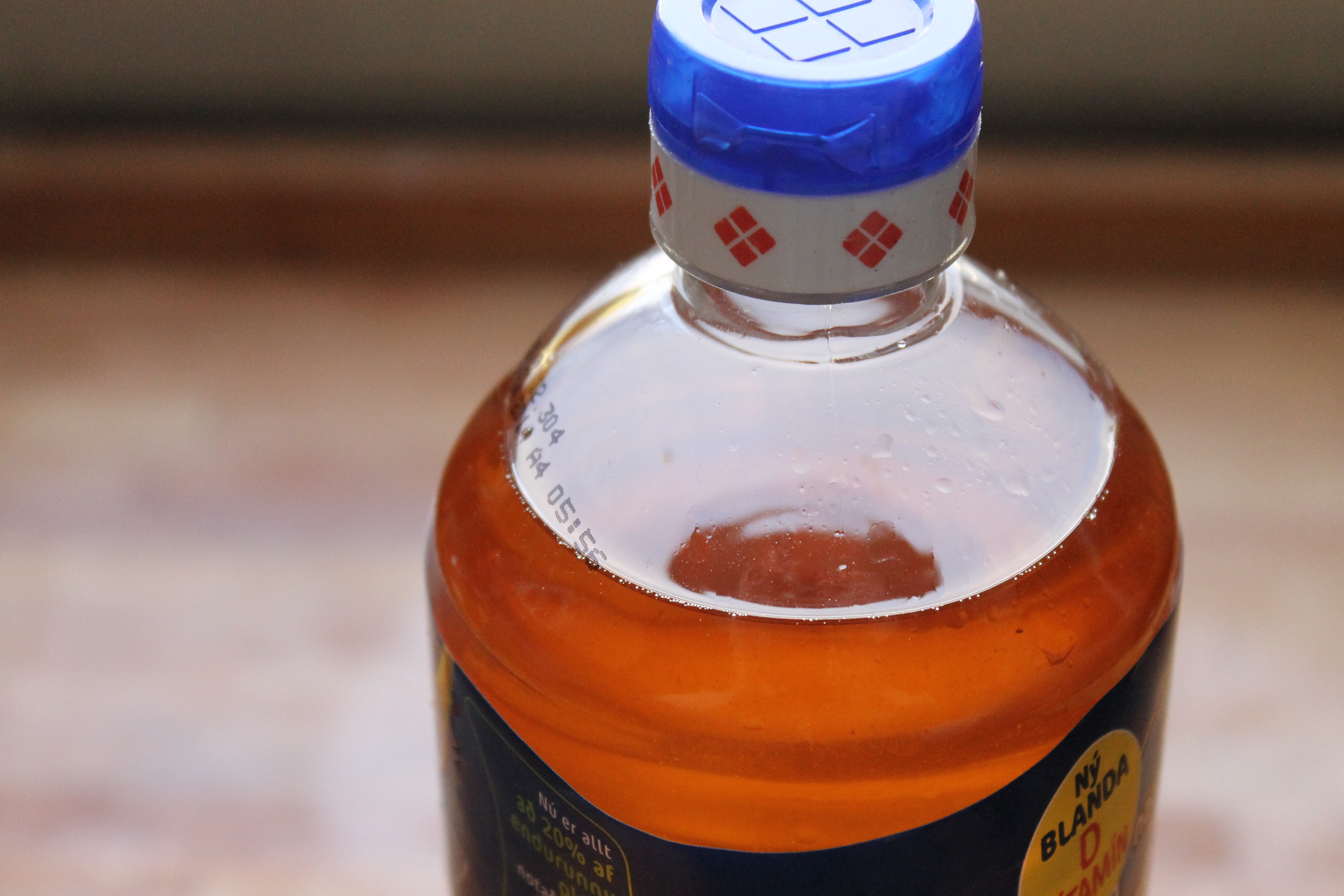 Það mætti halda að kjúkingurinn – eða hjúpurinn allavega – drykki í sig olíu eins og svampur. En í rauninni gerist það ekki. Ég síaði olíuna og hellti henni aftur í flöskuna þegar hún var köld til nota síðar og eins og sjá má vantaði nú ekki mikið upp á. Ég mældi og það var rétt rúm matskeið sem hafði farið – og þá er meðtalið það sem eftir sat í pottinum og síunni og það sem ég subbaði niður þegar ég var að hella olíunni á milli.