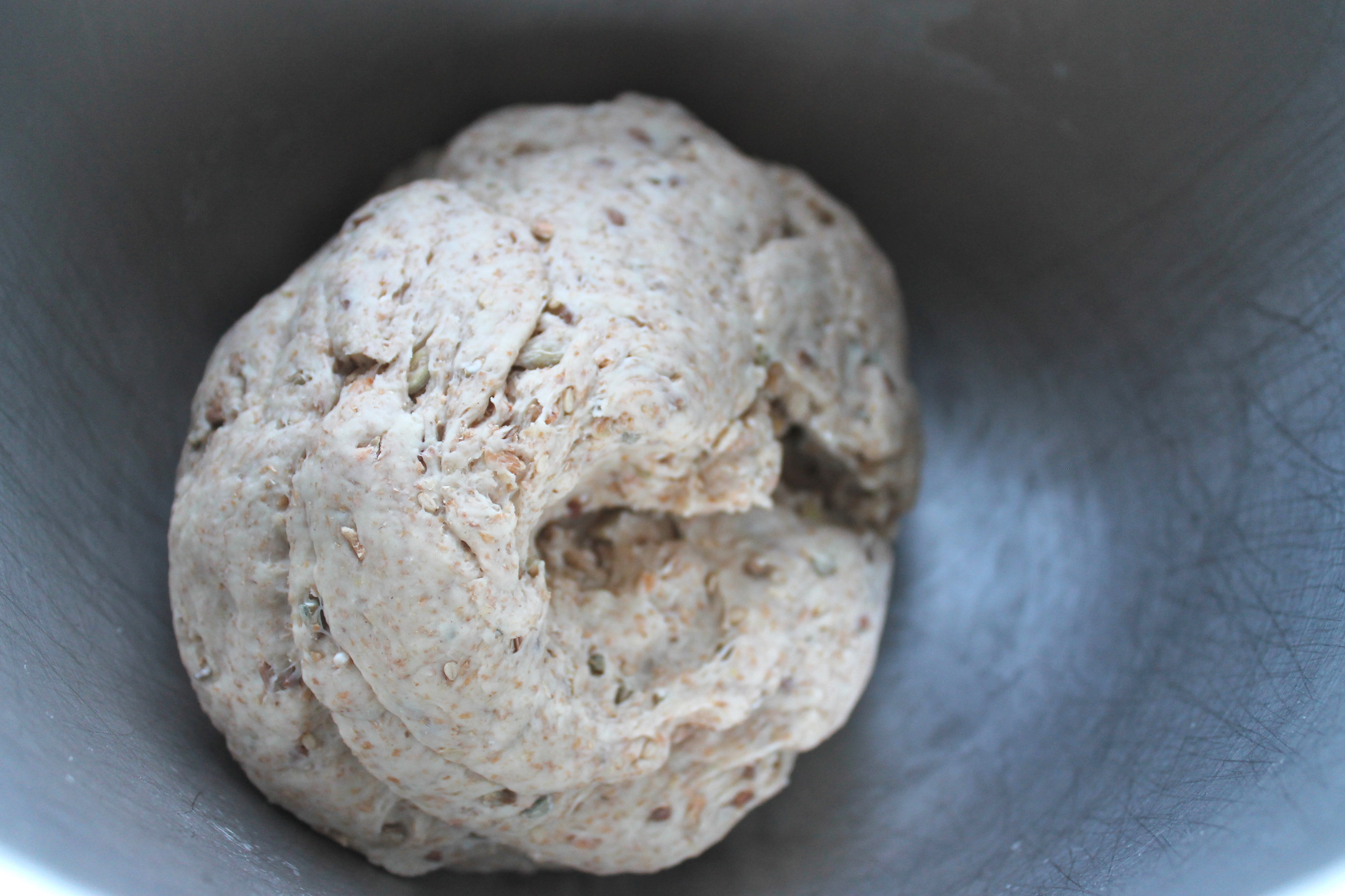 Ég lét vélina hnoða deigið góða stund, þar til það var slétt og skálin hrein að innan. Deigið á að vera mjúkt og svolítið rakt – eða allavega ekki þurrt – en það á að vera auðvelt að hnoða það án þess að það klessist við hendurnar. Ég breiddi rakt viskastykki yfir skálina og lét deigið lyfta sér í svona 1-1 1/2-2 klst.