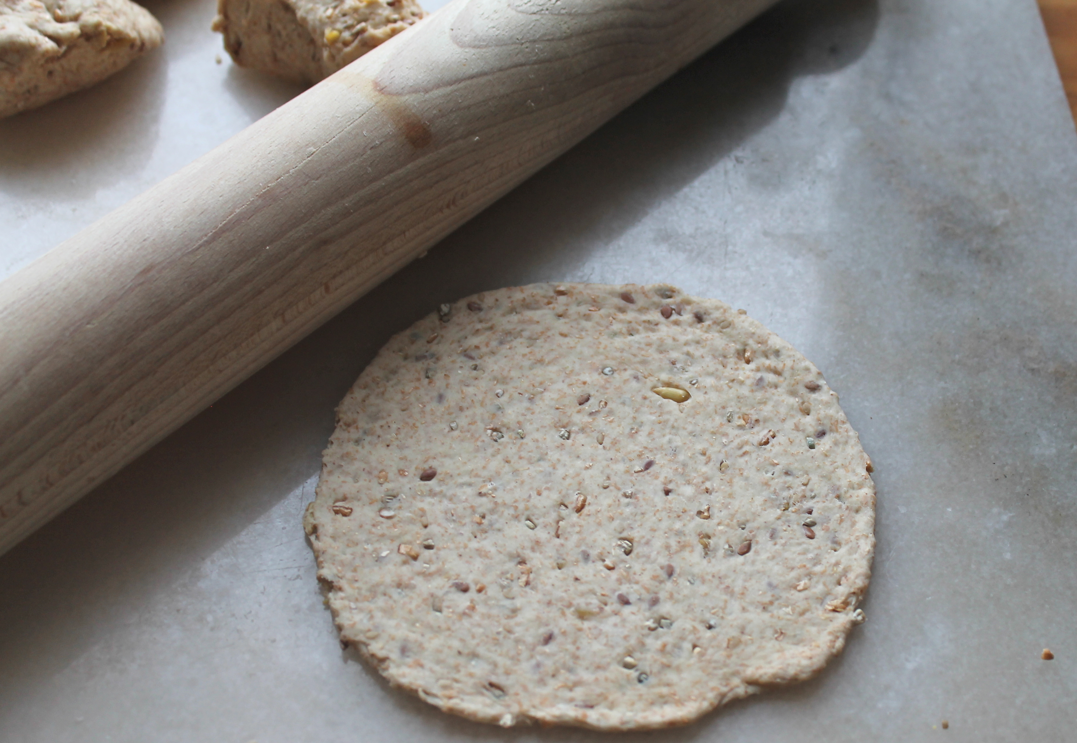 Ég skipti flatbrauðspartinum í fjóra hluta og flatti hvern um sig út í kringlótta, þunna köku. Raðaði þeim á pappírsklædda bökunarplötu og lét brauðið lyfta sér í svona hálftíma en hitaði á meðan ofninn í 225°C.
