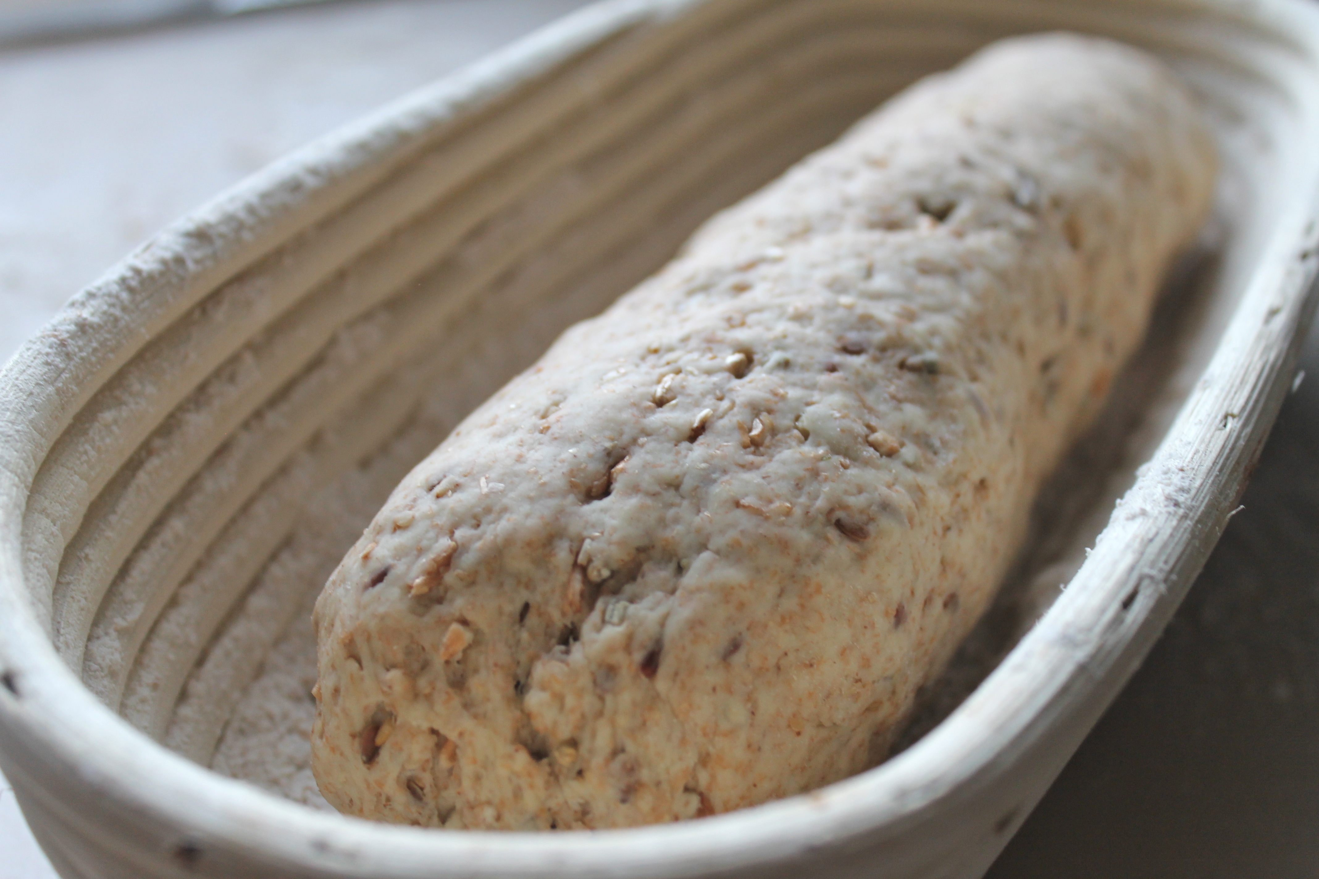 Ég mótaði sívalt brauð úr afganginum af deiginu og setti í hefunarkörfu, vel heilhveitistráða. Það má líka nota venjulega körfu eða skál, aflanga eða kringlótta, breiða viskastykki yfir og strá hveiti á það áður en deigið er sett í körfuna/skálina. Ég lét það svo lyfta sér í svona 40-50 mínútur.