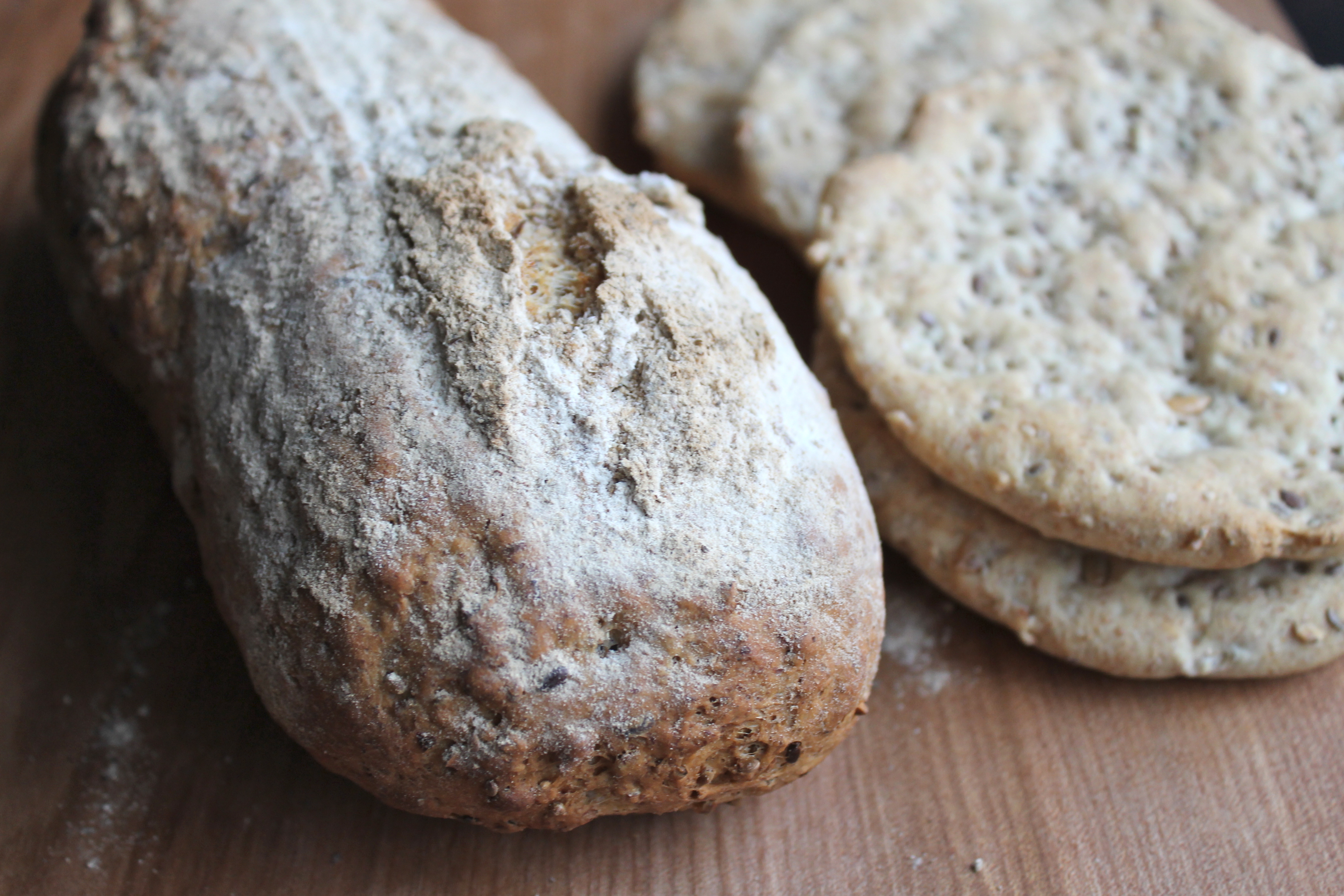 En ég bakaði semsagt brauð. Þetta er ekki ísskápsbrauð eins og algengast er að ég baki (þótt það mætti svosem alveg geyma deigið), heldur gróft fimmkornabrauð sem ég bakaði annars vegar sem flatbrauð og hins vegar sem brauðhleif. Þar sem ég notaði nákvæmlega sama deigið hafði ég dálítið minni vökva en venjulega til að geta flatt það út í flatbrauðin.