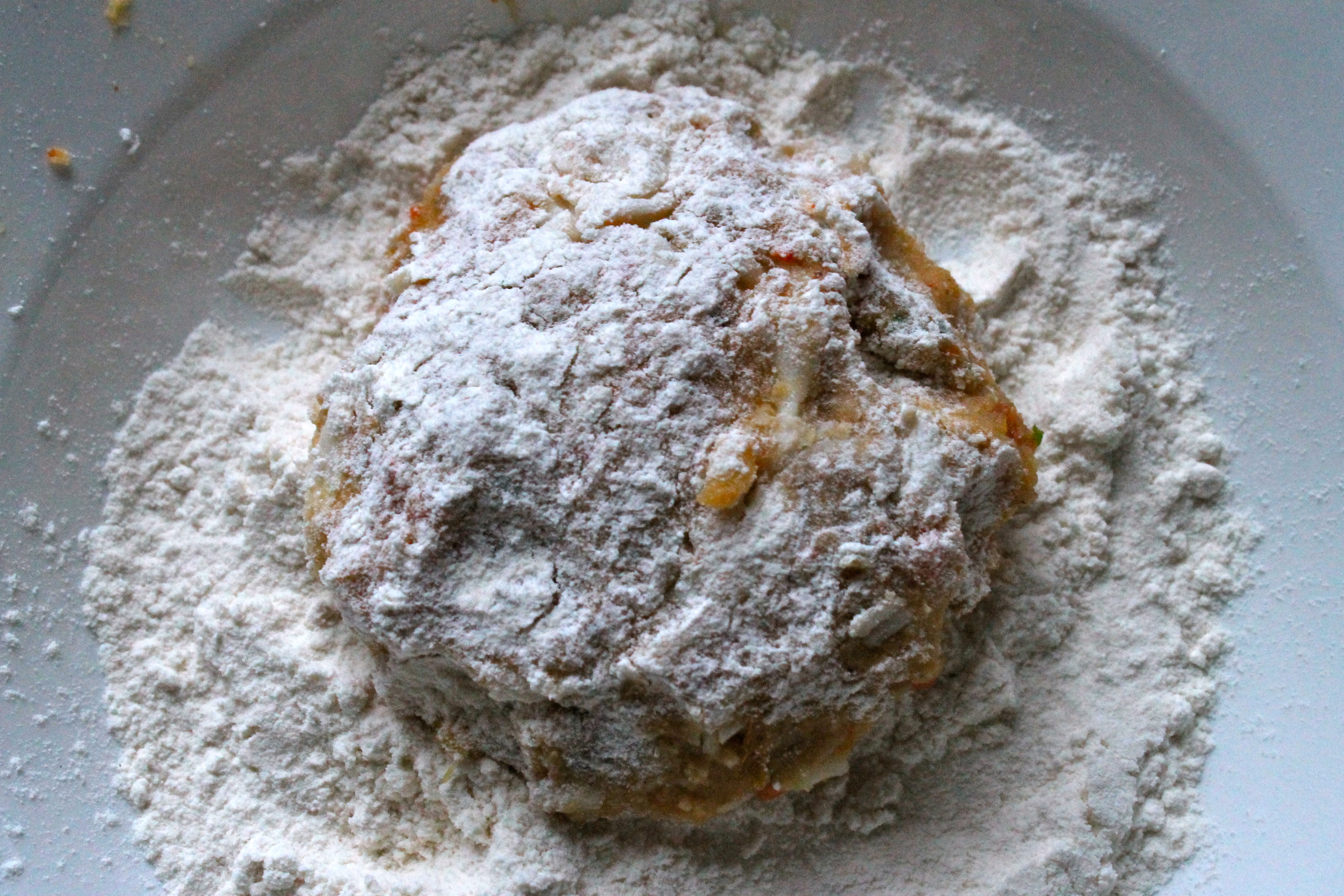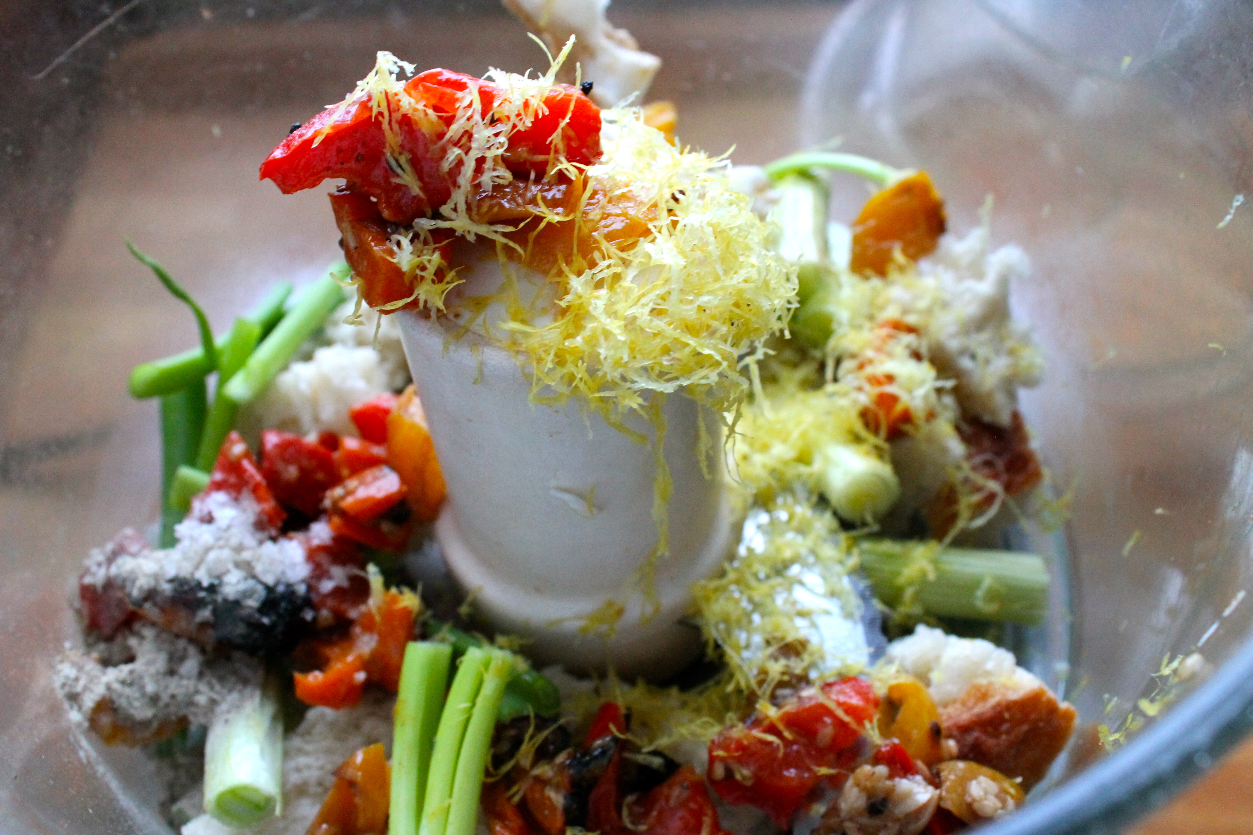 Ég sauð kartöflurnar þar til þær voru meyrar og á meðan reif ég brauðið smátt og setti í matvinnsluvélina ásamt vorlauknum, paprikunni (en ekki fiskinum), rifnum berki af 1/2 sítrónu, pipar og salti.
