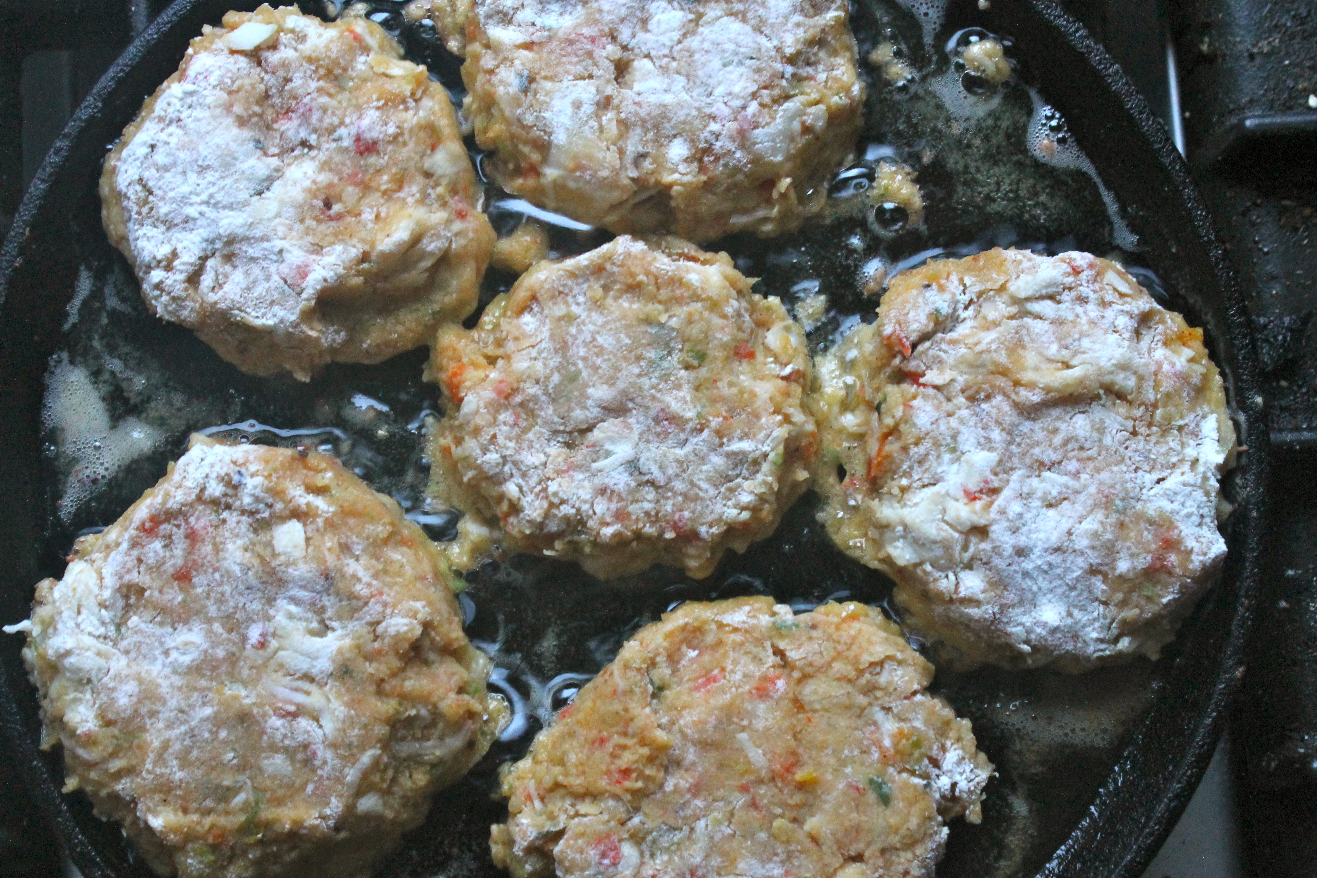 Ég hitaði svona 2 msk af olíu á pönnu og steikti buffin við meðalhita í nokkrar mínútur á hvorri hlið, þar til þau voru fallega gullinbrún. Það þarf ekkert að steikja þau í gegn þar sem fiskurinn, kartaflan og grænmetið er allt foreldað.