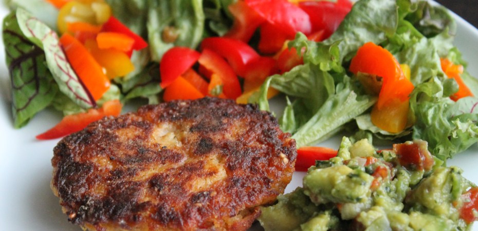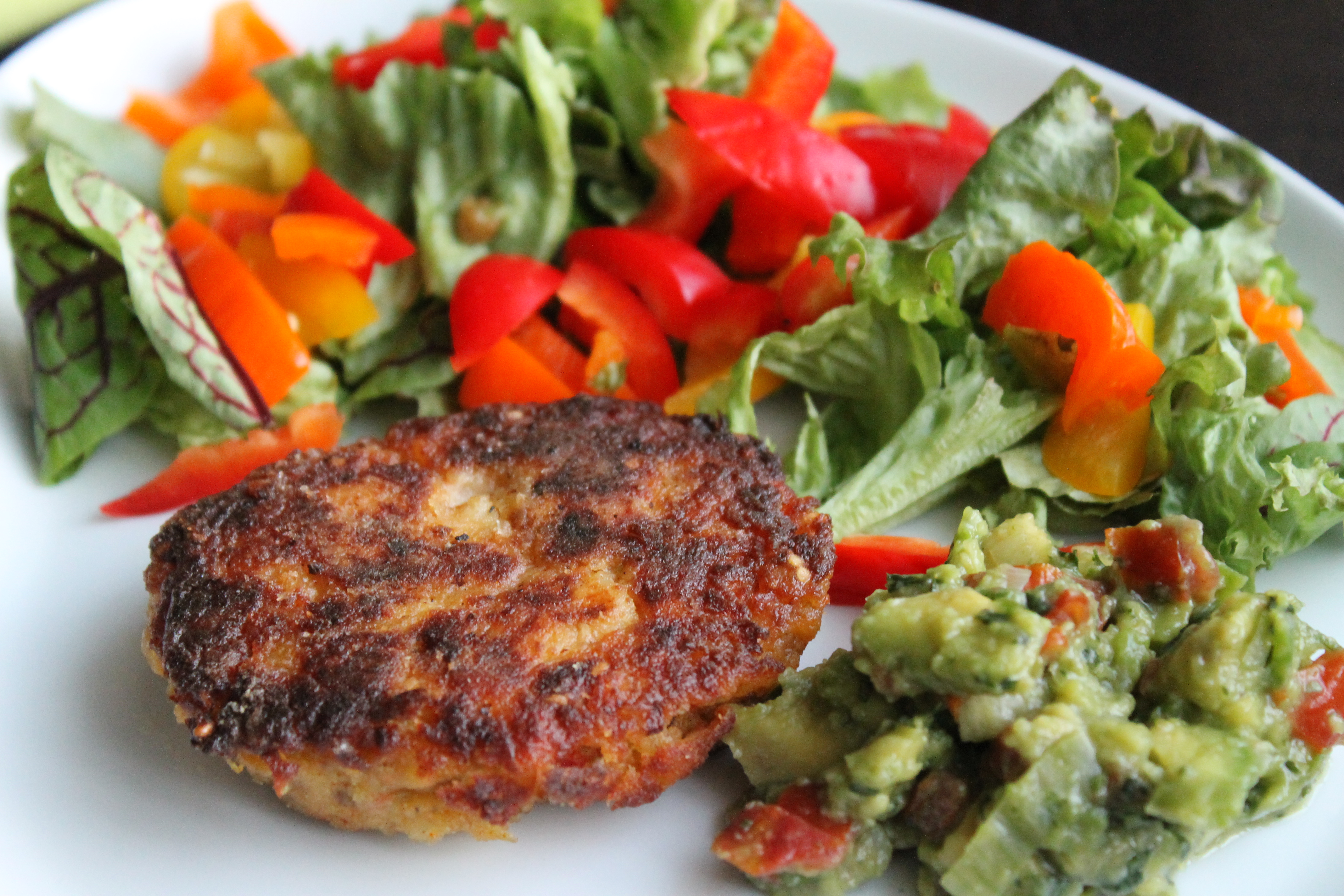 Ég átti afgang af guacamole (enn fallega grænu af því að ég hafði þrýst plastfilmu á yfirborðið) og hafði það með, ásamt salati úr salatblöndu og saxaðri papriku – það var semsagt bæði paprika í buffunum og með þeim.