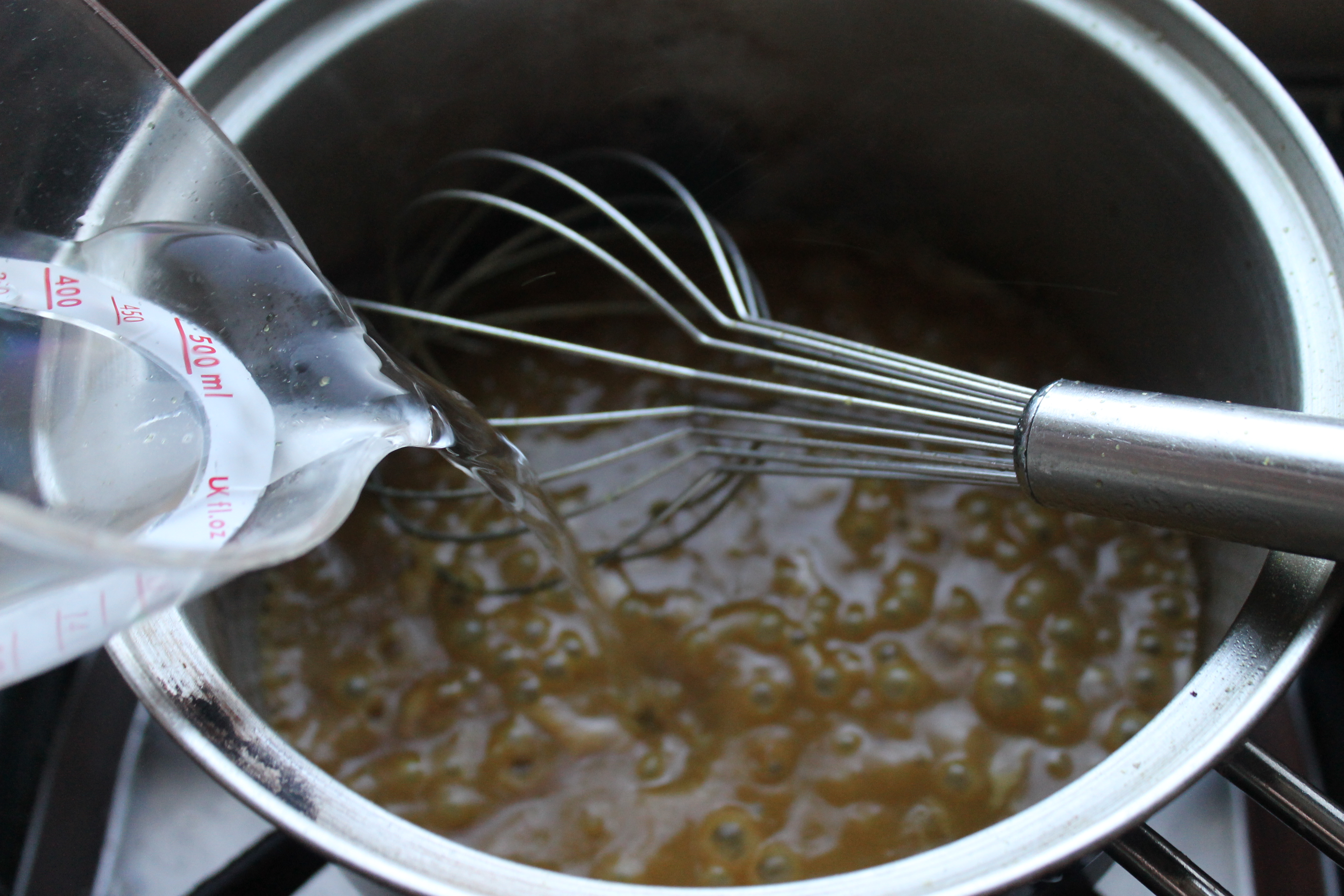 Á meðan gerði ég karrísósuna í litlum potti: Bræddi 2 msk af smjöri og lét það reyndar brúnast ögn (en ekki brenna), þess vegna er sósan svona dökk. Hrærði svo 2 msk af hveiti og 2 tsk af karrídufti (eða eftir smekk) saman við og lét krauma í hálfa til eina mínútu. Þá hellti ég 300 ml af vatni saman við smátt og smátt og bakaði sósuna upp. Hrærði 2 tsk af fiskikrafti saman við, smakkaði og kryddaði með ögn af pipar og salti og lét sósuna malla í 5 mínútur.
