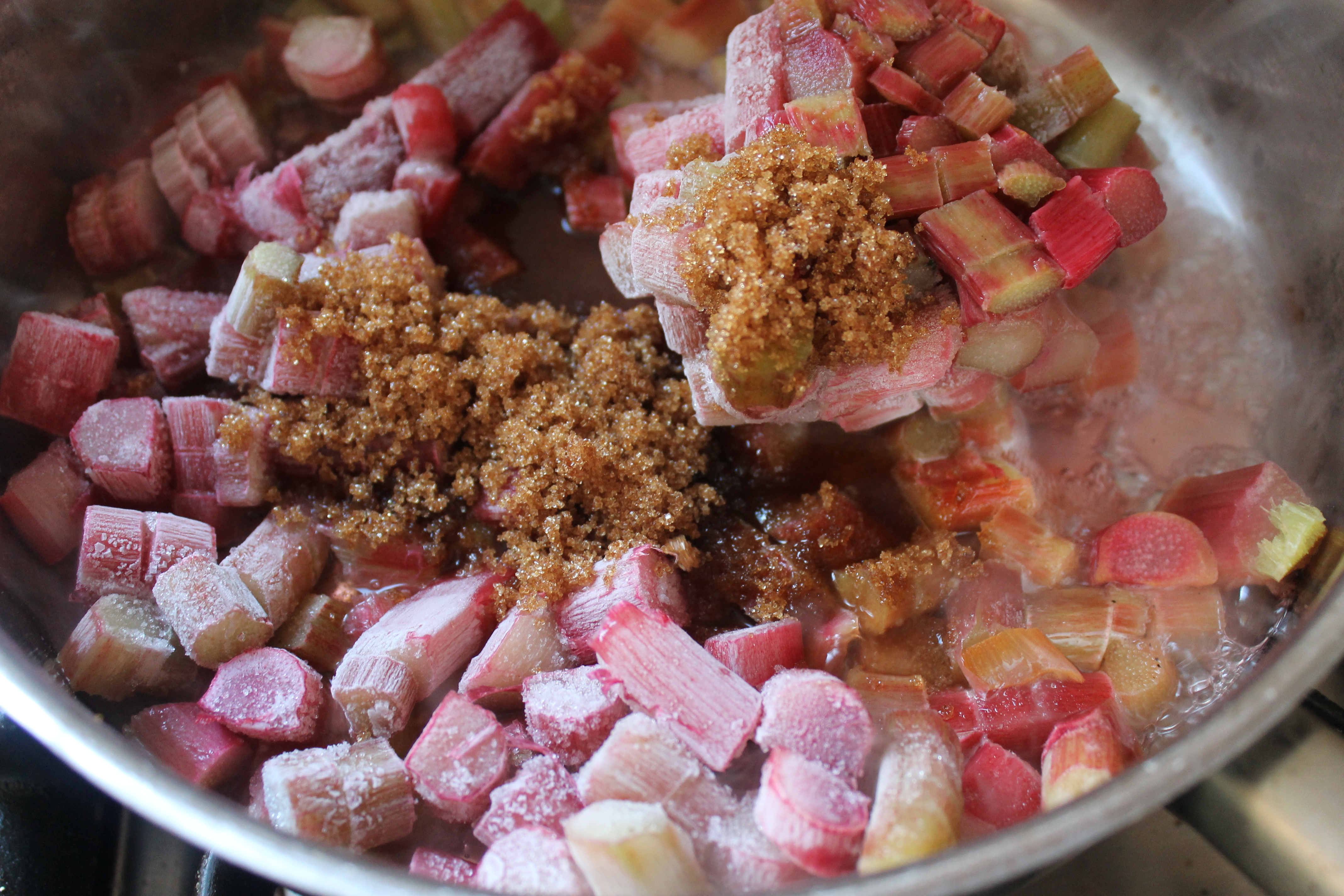Ég byrjaði á að hita ofninn í 190°C og svo tók ég 500 g af frosnum, niðurskornum rabarbara og setti beint í pott. Bætti við 5 msk (3/4 dl) af púðursykri og lét þetta sjóða smástund, eða bara rétt þar til rabarbarinn var þiðnaður og fullt af safa hafði runnið úr honum.