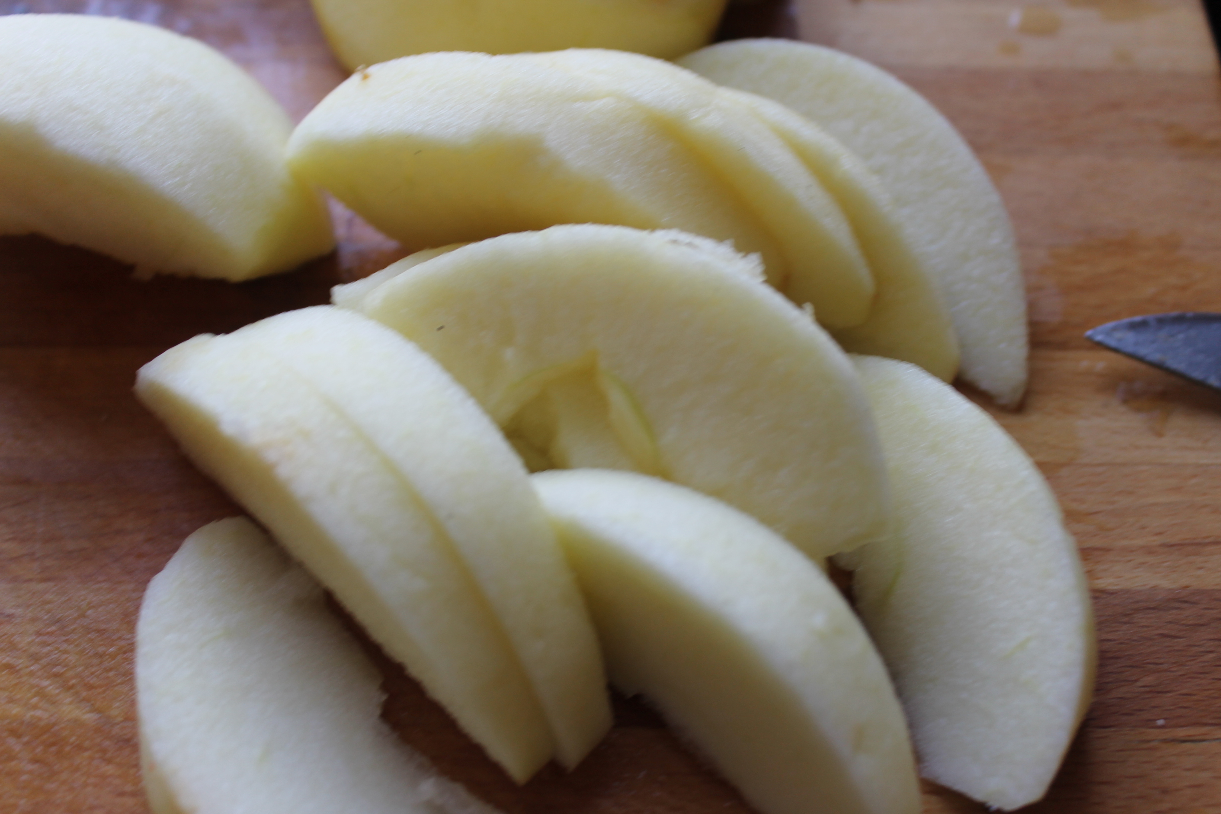 Á meðan tók ég tvö epli (ég var með Jonagold en ekki þessi stóru), flysjaði þau, kjarnhreinsaði og skar hvort um sig í 16 geira.