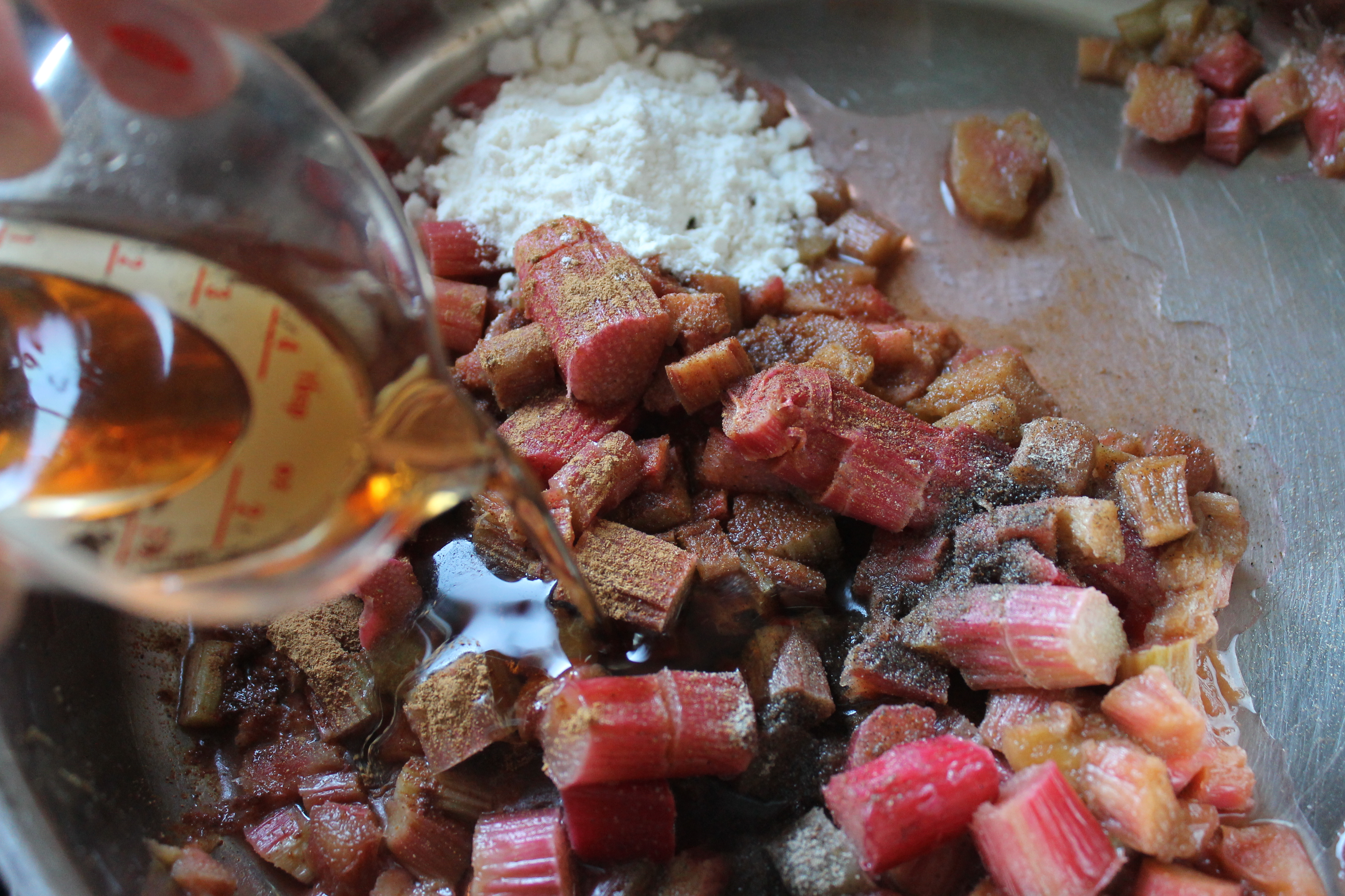 Hveitið er til að þykkja fyllinguna, þar sem rabarbarinn á eftir að skila frá sér meiri safa og eplin líka. Ef ekki er sett hveiti eða annað þykkingarefni gæti fyllingin orðið of blaut.
