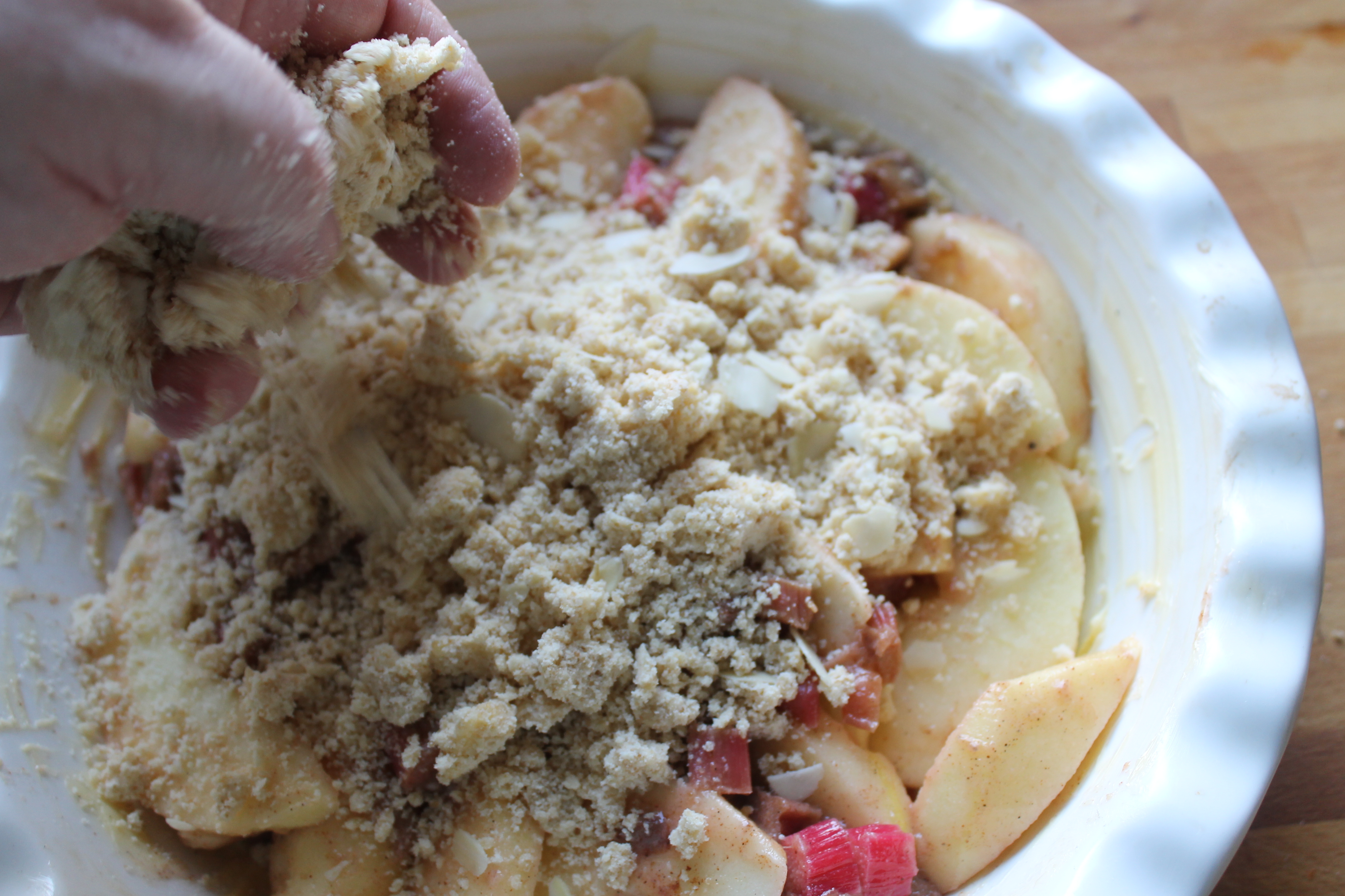 Ég setti 200 g af hveiti og 3 msk af sykri í skál og skar 125 g af köldu smjöri í litla bita og muldi saman við með fingrunum. Jújú, það er hægt að nota matvinnsluvél en í þessu tilviki er mun betra að nota hendurnar. Bætti svo við 2-3 msk af möndluflögum og muldi saman við.