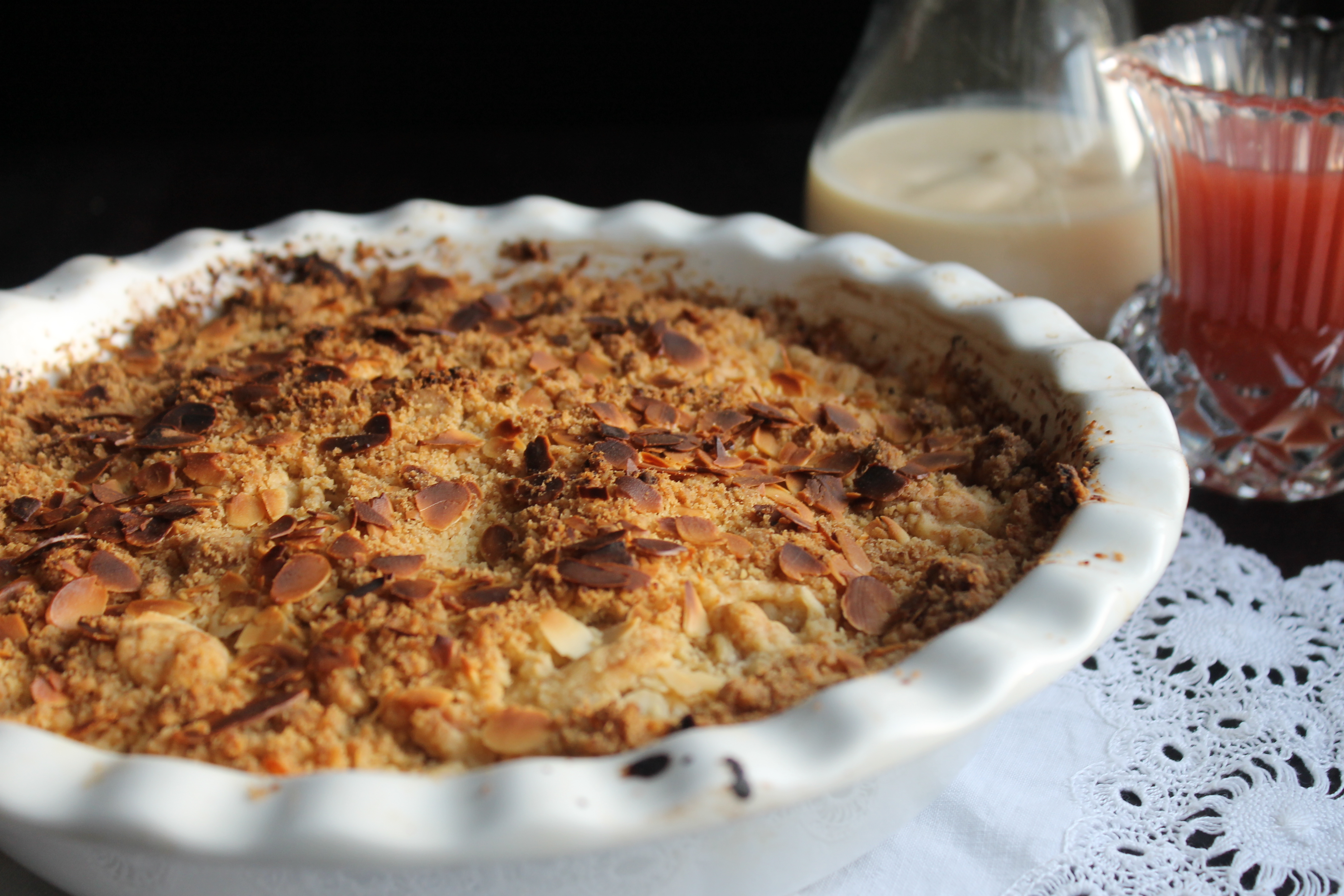 Svo stráði ég mylsnunni jafnt yfir ávextina í forminu, stráði 1 msk af möndluflögum í viðbót yfir og bakaði þetta á næstneðstu rim í um 25 mínútur, eða þar til mylsnuþekjan var stökk og hafði tekið góðan lit.