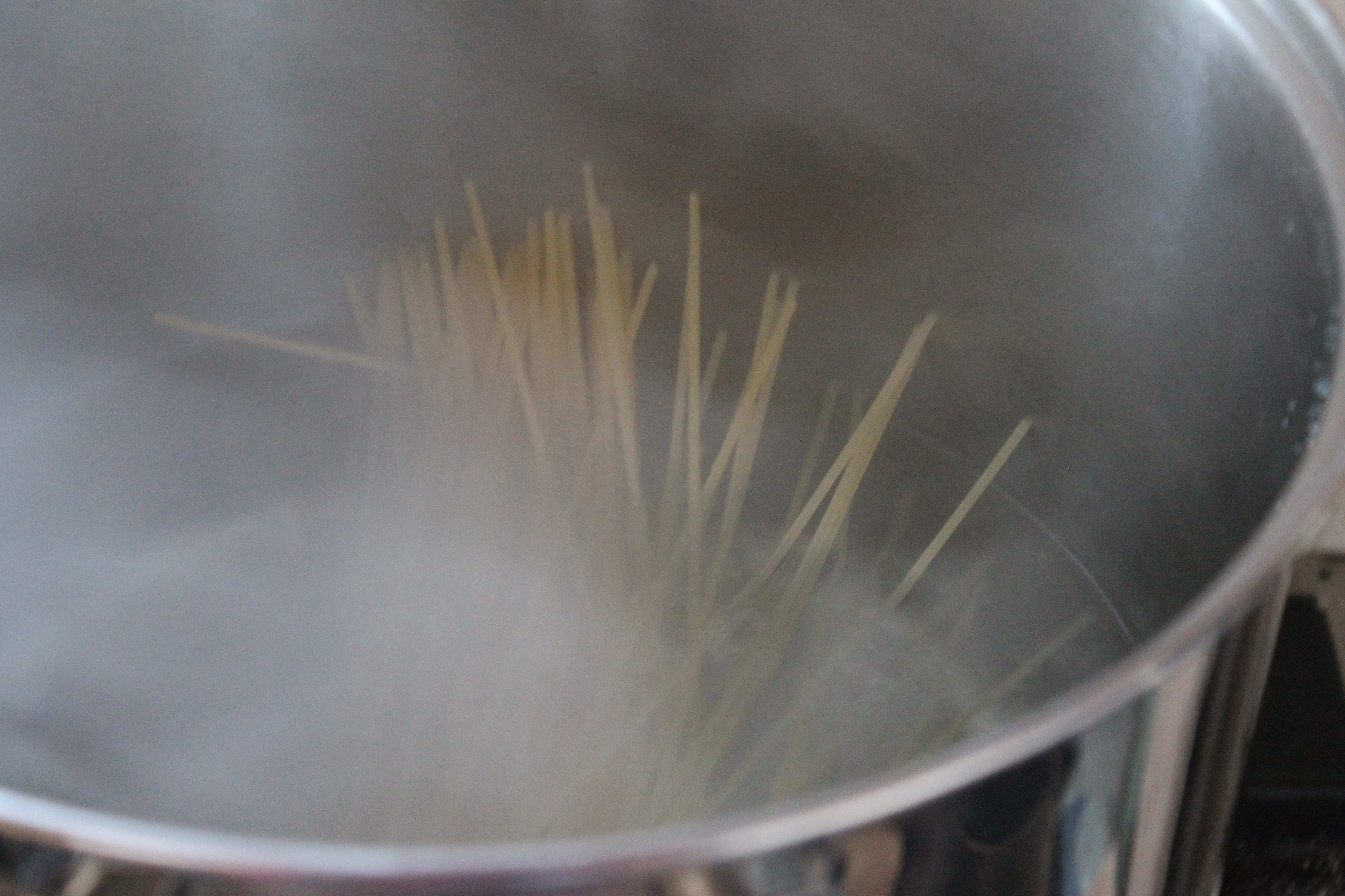 Allavega: Ég hitaði vatn í potti, saltaði það og setti allt spaghettíið úr spaghettíkrukkunni (sem var hæfilegur skammtur fyrir 1-2) út í þegar vatnið var farið að sjóða vel. Hrærði og sauð það í – æi, 10 mínútur, held ég.