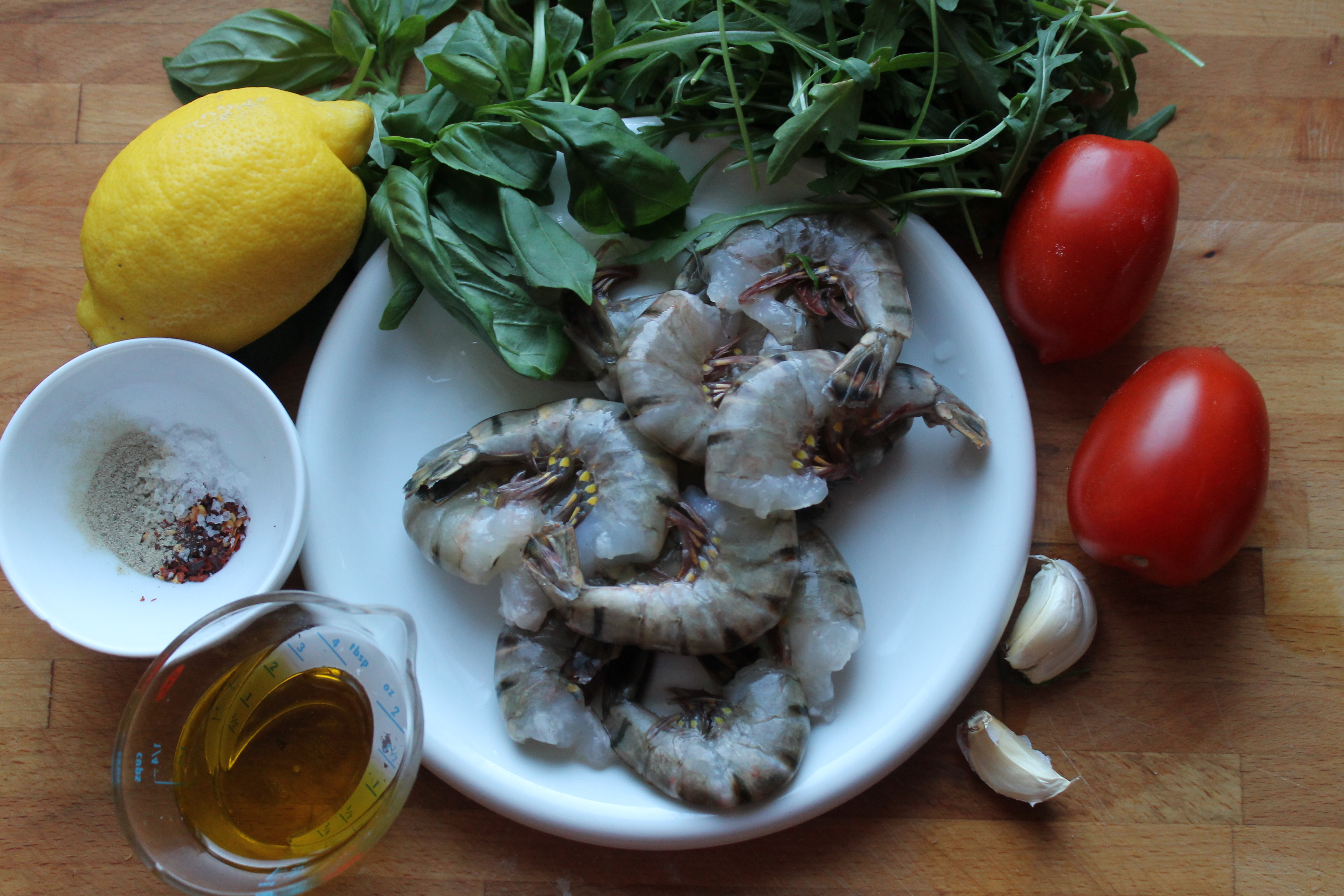 Ég tók svona 12 risarækjur í skel (þær eru mjög fljótar að þiðna ef pokinn með þeim er settur í vatn sem er ekki alveg ískalt en ekki beint volgt), 2 mjög vel þroskaða plómutómata, 2 hvítlauksgeira, lófafylli af basilíku og aðra af klettasalati, 1 sítrónu (notaði bara safann), 2 1/2 msk af ólífuolíu, dálitla klípu af chili-flögum, pipar og salt.