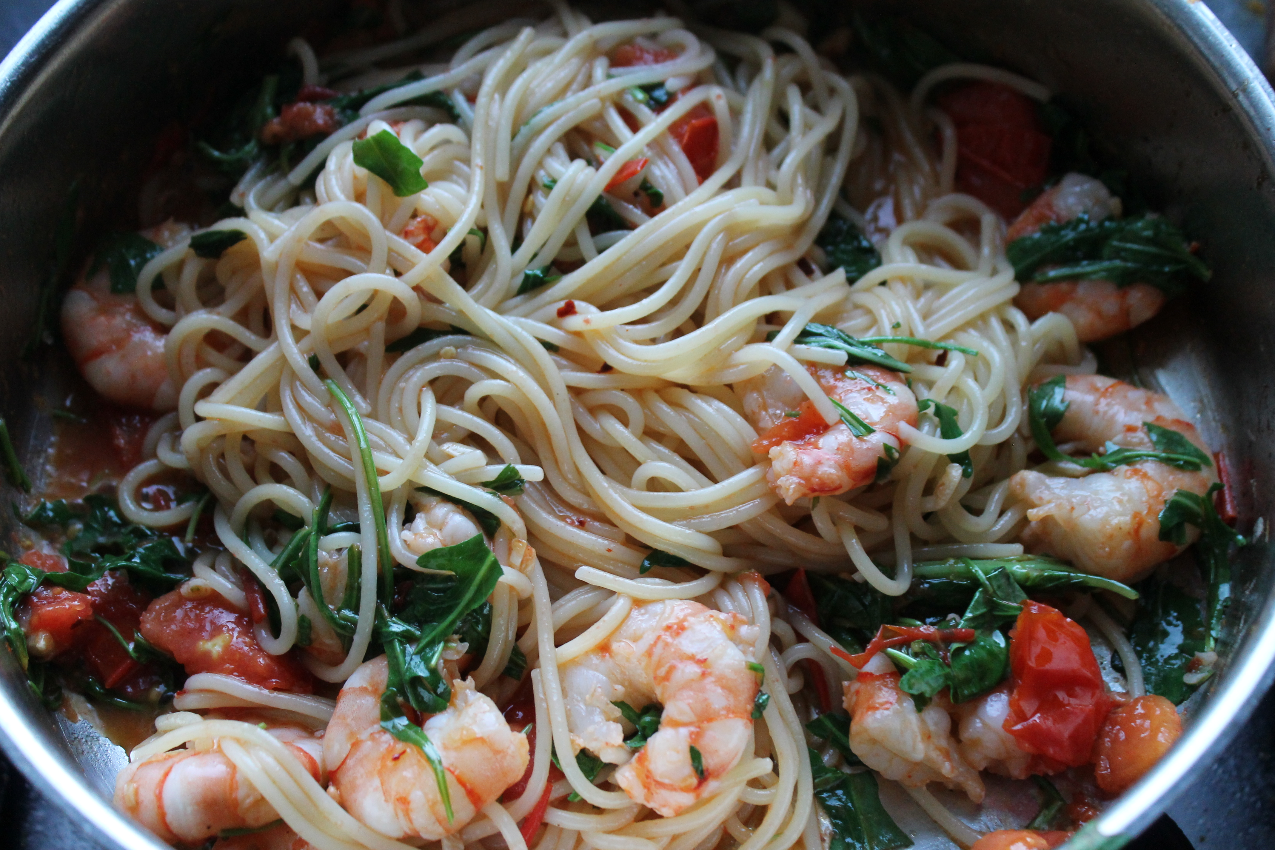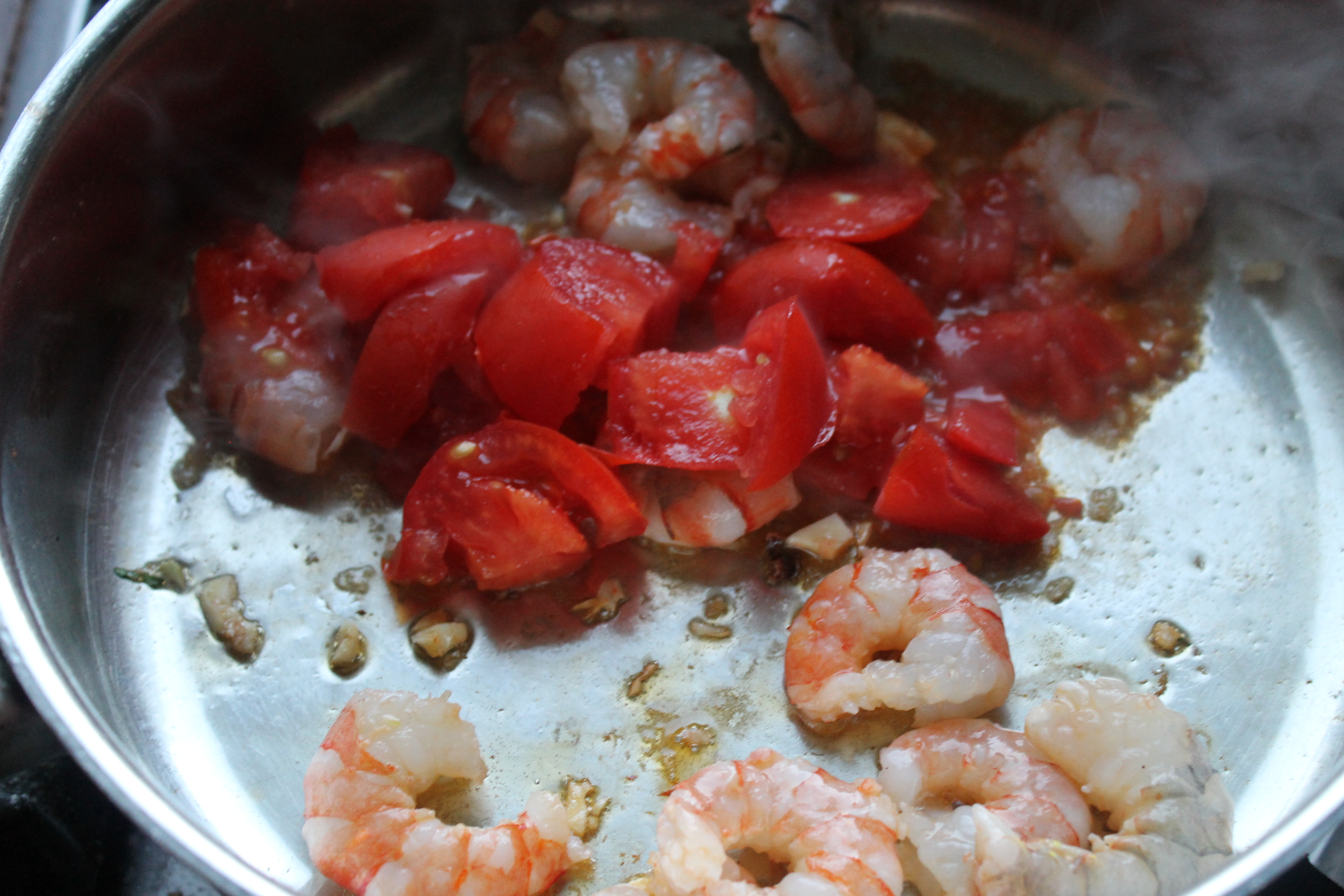 Ég steikti rækjurnar við háan hita í svona mínútu (hrærði á meðan) og svo setti ég hvítlaukinn, tómatana, chili-flögurnar, piparinn og saltið á pönnuna og steikti áfram í 1-2 mínútur.