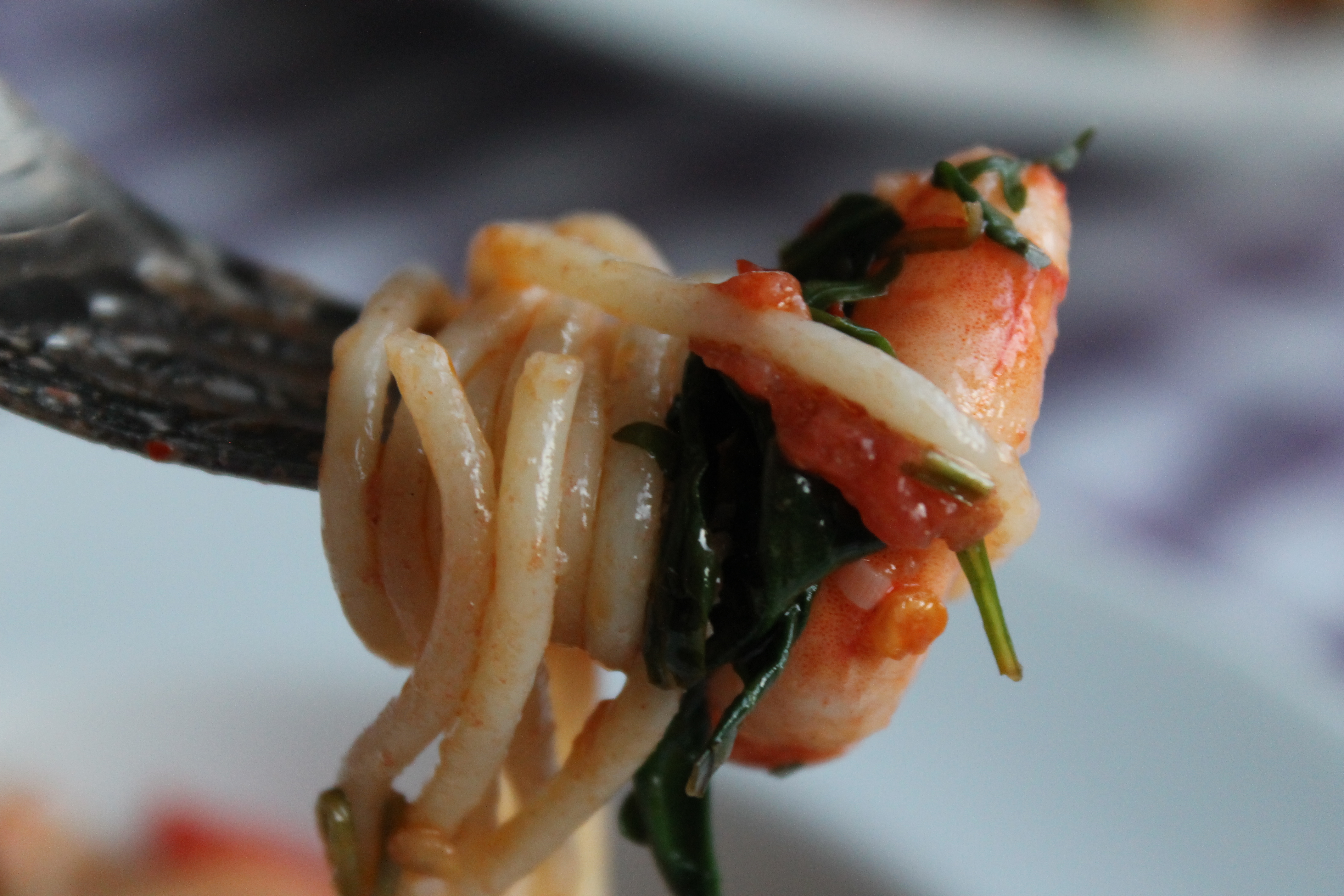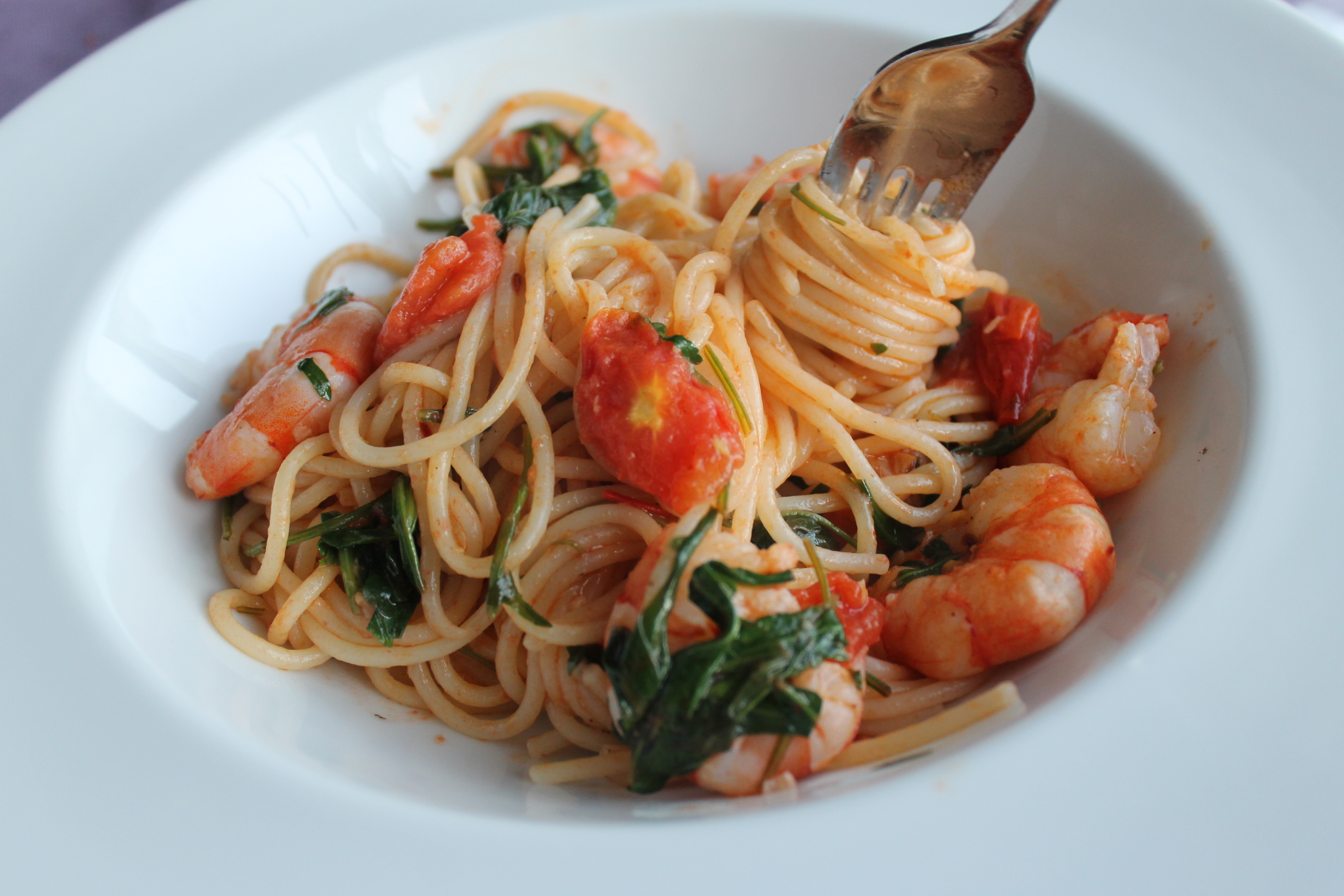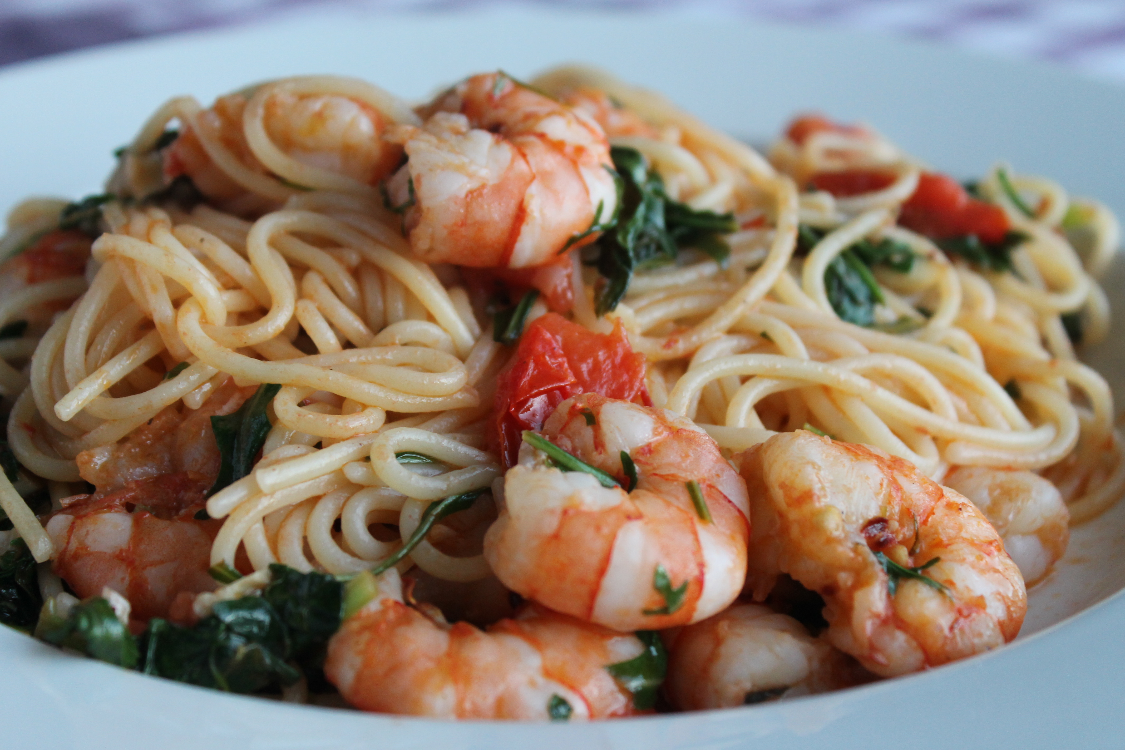 En allavega, eins og ég nefndi er ég að reyna að minnka aðeins innihald frystiskápsins og núna ákvað ég að nota nokkrar risarækjur sem ég átti þar. Og mér datt í hug að nota þær í pastarétt. Spaghettírétt nánar til tekið. Eitthvað einfalt en gott, þar sem pastað og rækjurnar væru aðalatriðið. Ég er mest fyrir slíka rétti, er ekkert sérlega hrifin af ,,pastaréttum“ þar sem pastað virðist nánar í aukahlutverki. En þá þarf líka að sjóða það almennilega svo það verði ekki bara uppfylling.