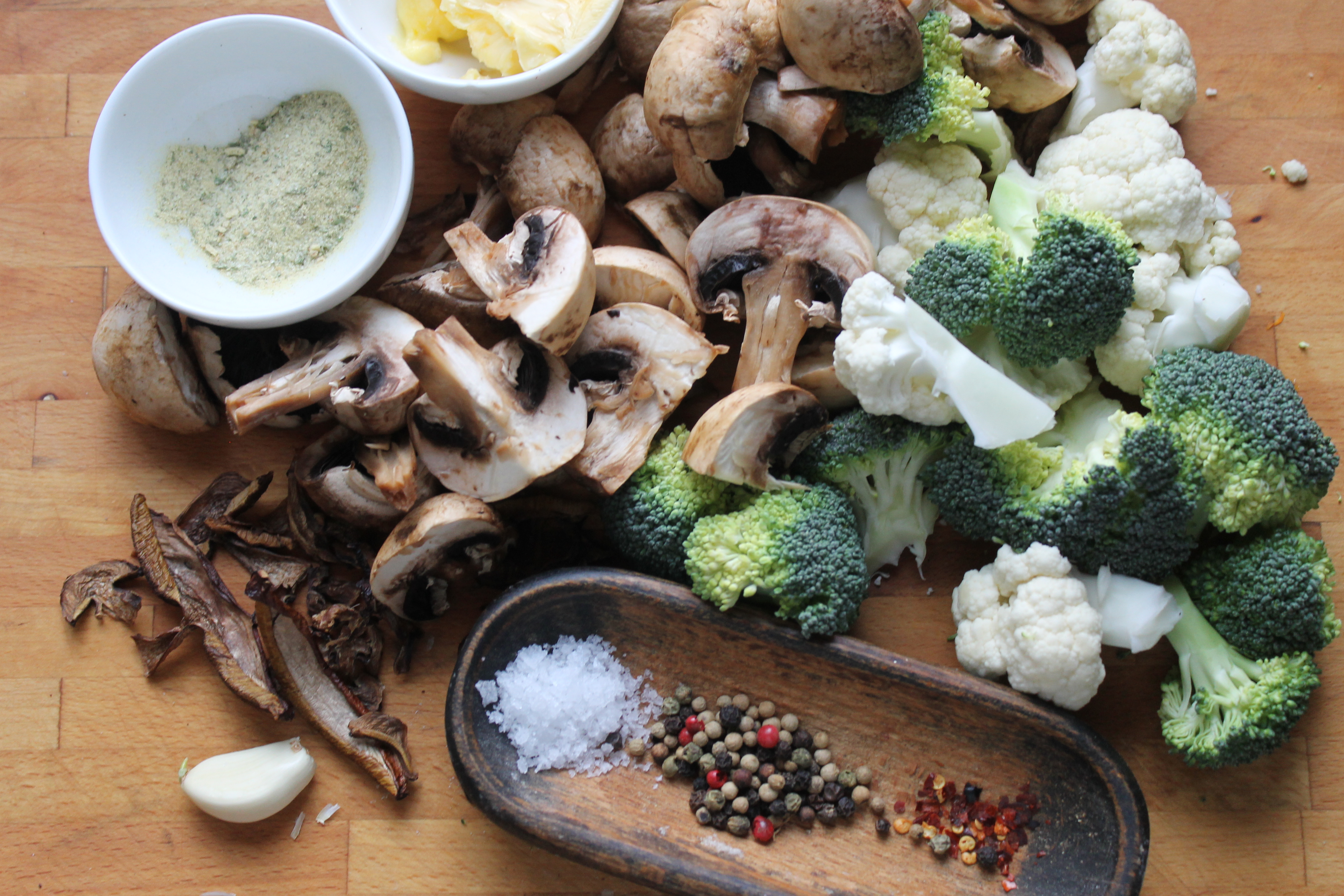 Veðurspáin fyrir daginn í dag var ekkert sérlega góð og ég ákvað að sjóða mér kraftmikla og krassandi sveppasúpu sem væri viðeigandi í slagviðri. Svo var nú veðrið skárra en til stóð … Allavega, ég var með 250 g af ætisveppum, þvegnum og þerruðum (aðeins meira um þá hér neðar), nokkra þurrkaða sveppi sem tengdadóttir mín tíndi í haust, 100 g blómkál, 100 g spergilkál, 2 msk af smjöri, 1 msk af grænmetiskrafti, 1 hvítlauksgeira, timjankvist (sem er ekki á myndinni), pipar, salt og ögn af chiliflögum.