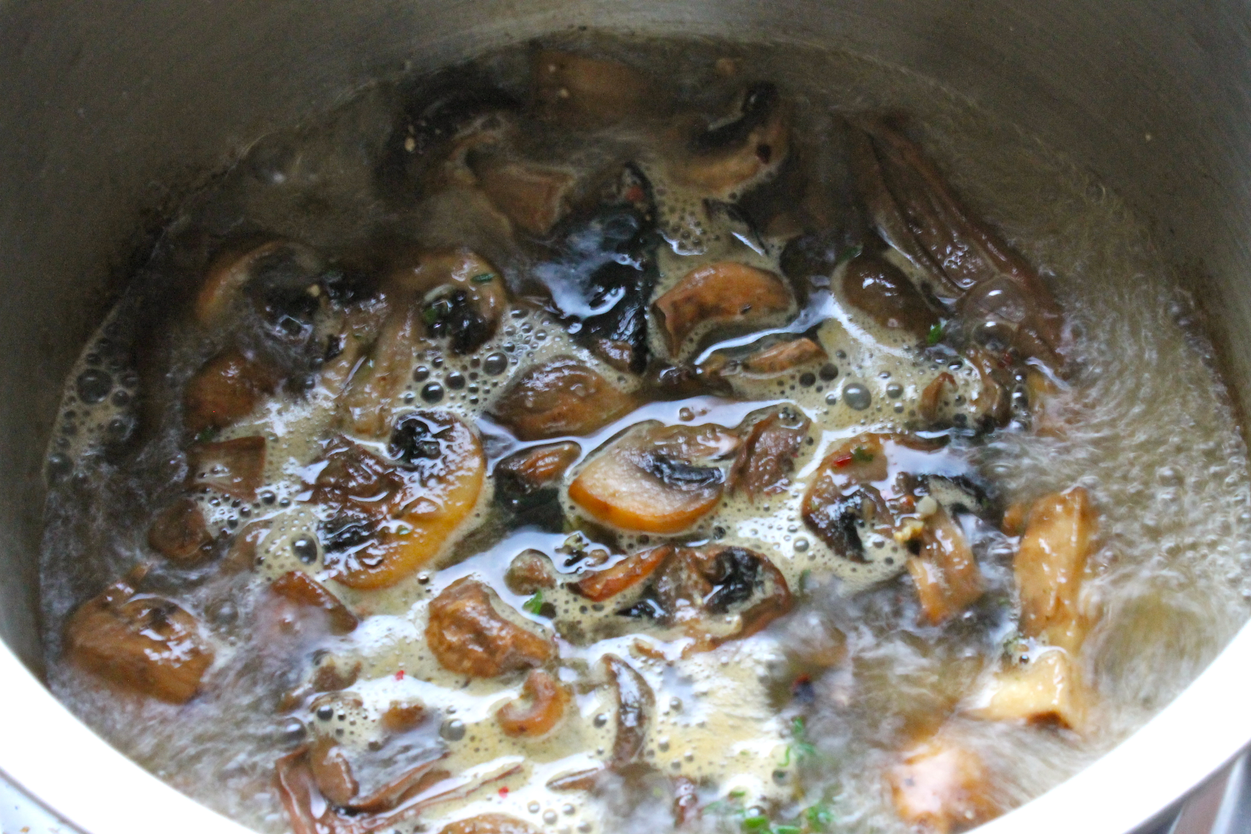 Ég hellti svo sveppunum og hvítlauknum í pottinn, kryddaði og lét þetta sjóða í 6-8 mínútur.