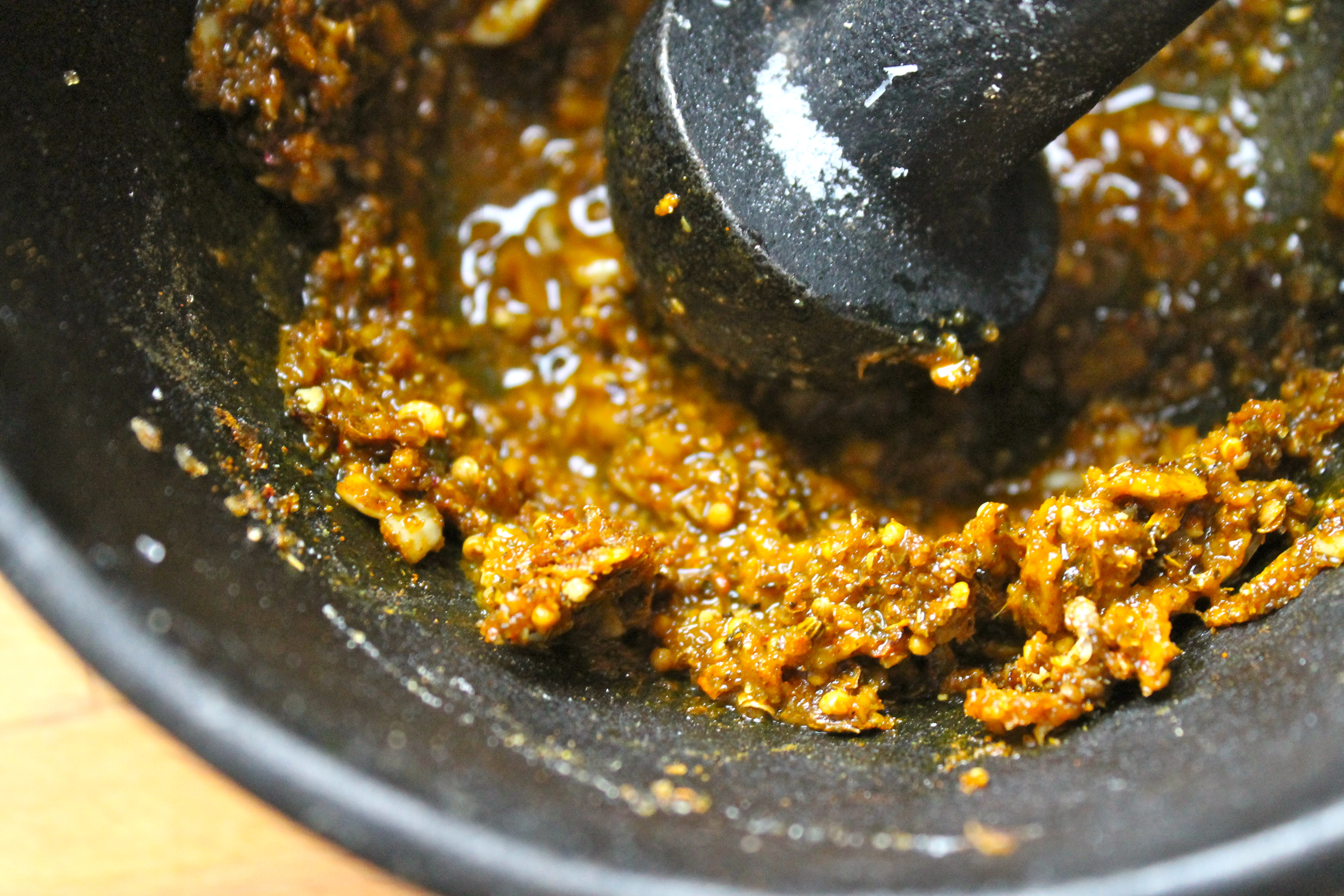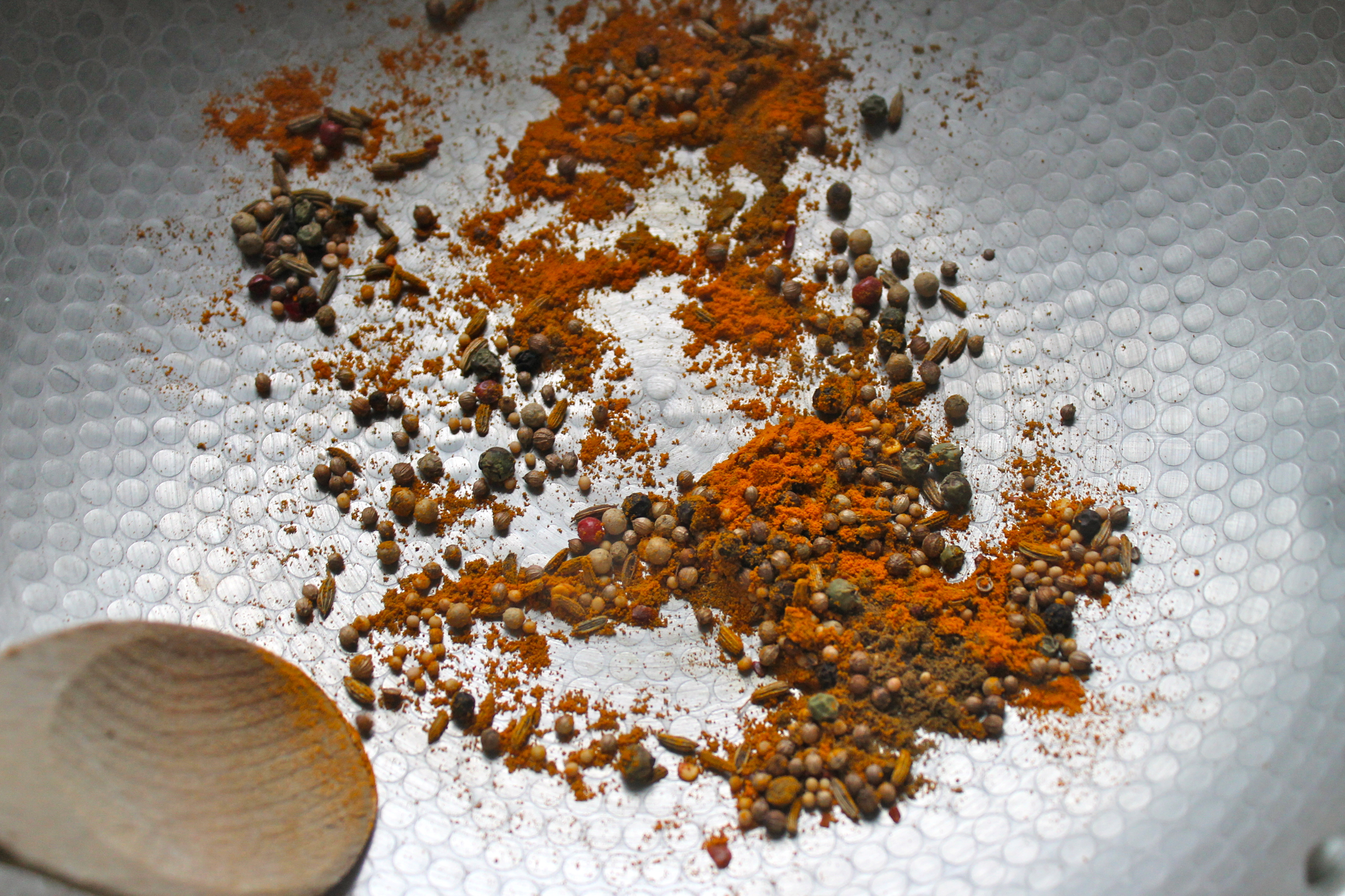 Ég setti kryddið í cataplana-pönnuna (þurra) og hitaði hana, ekki við of háan hita. Hrærði í kryddinu þar til það var farið að ilma en ekki brenna. Þá tók ég pönnuna af hitanum og hellti kryddinu í mortél.