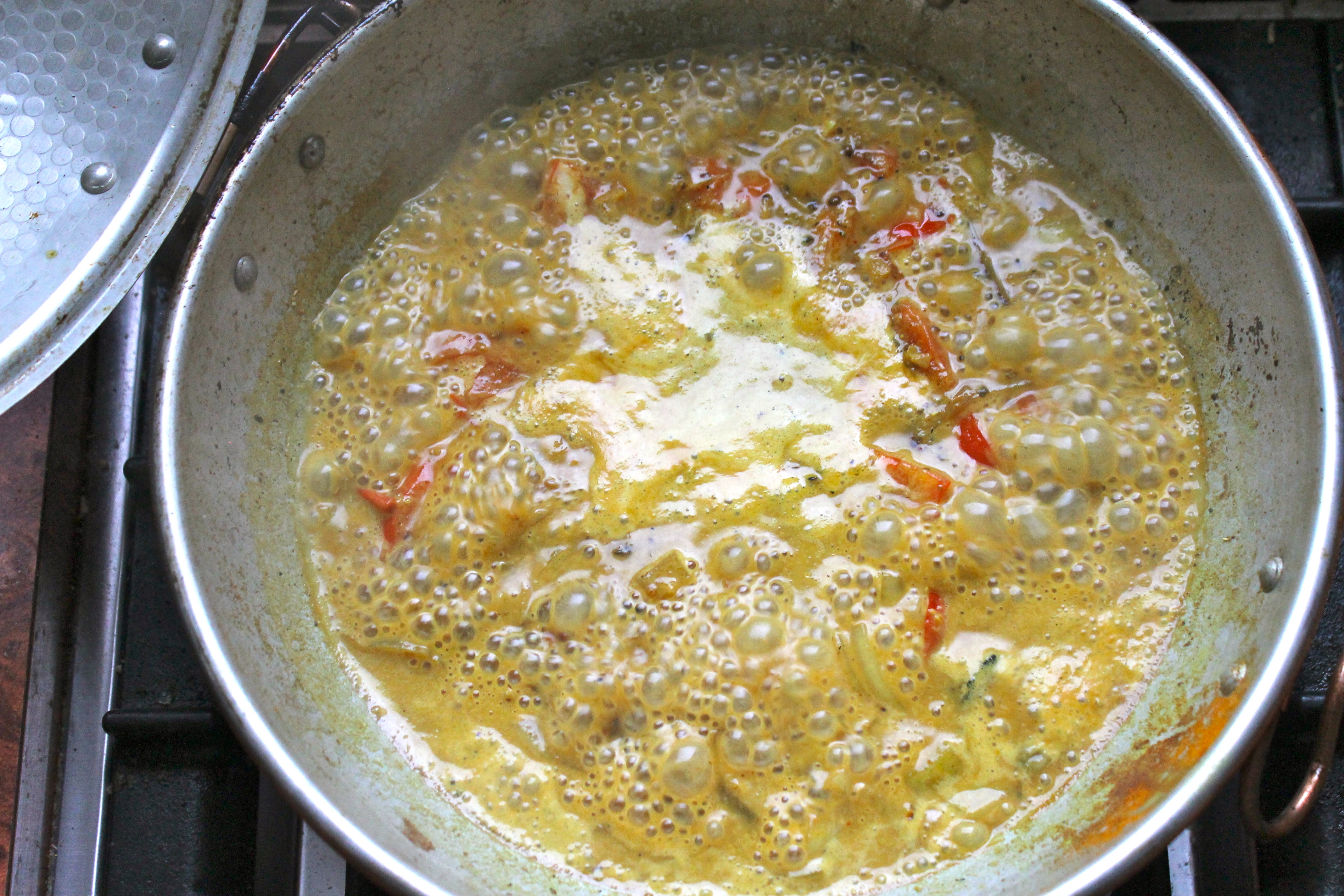 Svo saxaði ég einn stóran, vel þroskaðan tómat og setti út í og hellti svo einni dós af kókosmjólk yfir. Hrærði vel, hitaði að suðu og lét malla í um 10 mínútur. Þá var sósan aðeins farin að þykkna (ef hún sýður of mikið niður má bæta svolitlu vatni við).