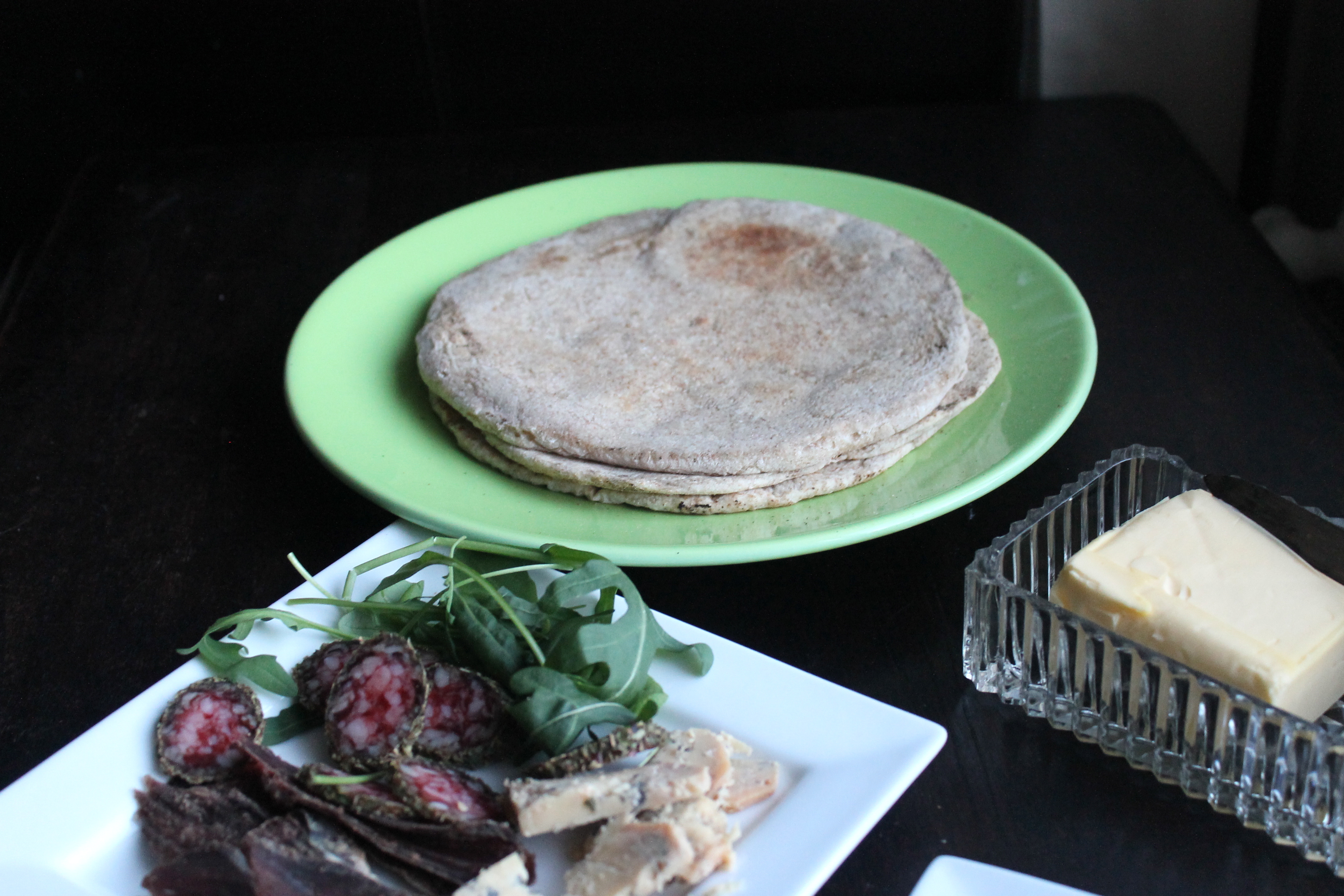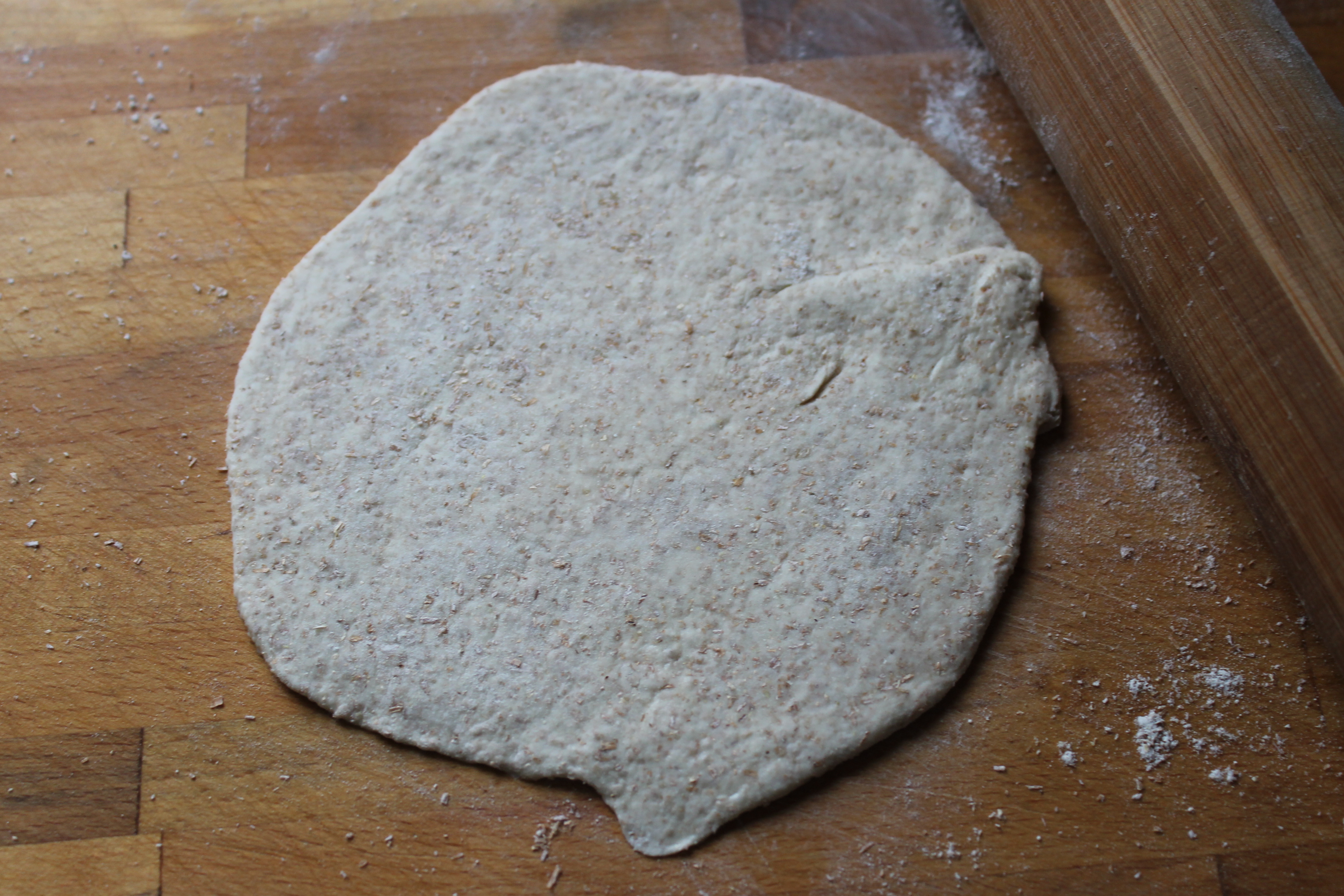 Hér kemur lýsing á tvenns konar flatbrauði (ekki mjög ólíku þó) sem ég hef bakað nýlega. Ég notaði í báðum tilvikum bara deig sem ég átti; annað var úr brauðhveiti og heilhveiti til helminga, hitt var ef ég man rétt eingöngu heilhveiti – þó getur verið að það hafi verið smávegis brauðhveiti í því líka. Annars var þetta bara grunnuppskriftin, 750 ml vatn, 1 msk ger, um 1 kg af mjöli (hveiti, brauðhveiti, heilhveiti, spelt, og má svo blanda einhverju rúgmjöli eða öðrum brauðgerðarefnum saman við eftir smekk) og rúmlega matskeið af salti.