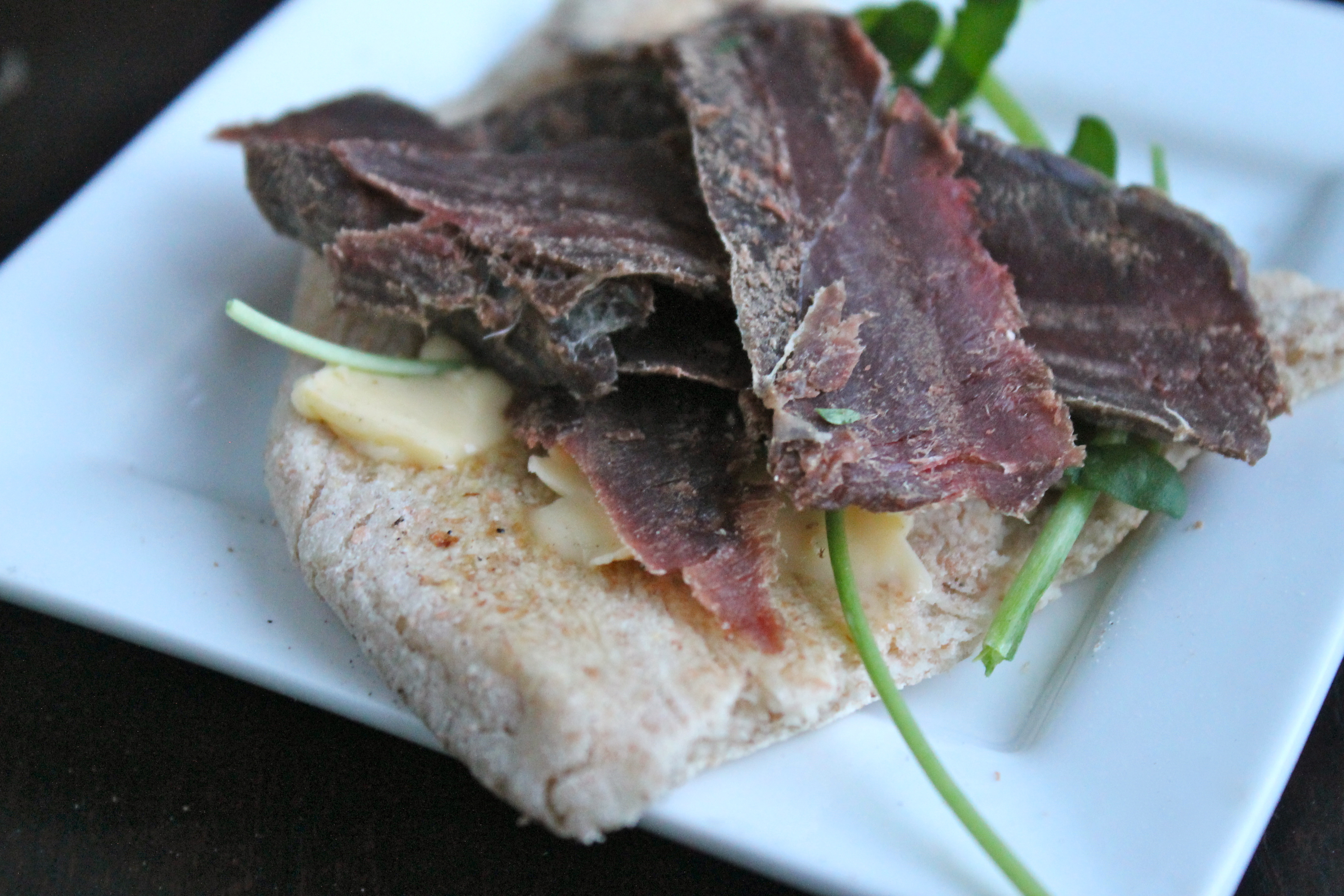 Volgt heilhveitiflatbrauð með smjöri, klettasalati og grafinni gæsabringu. Alls ekki sem verst …
