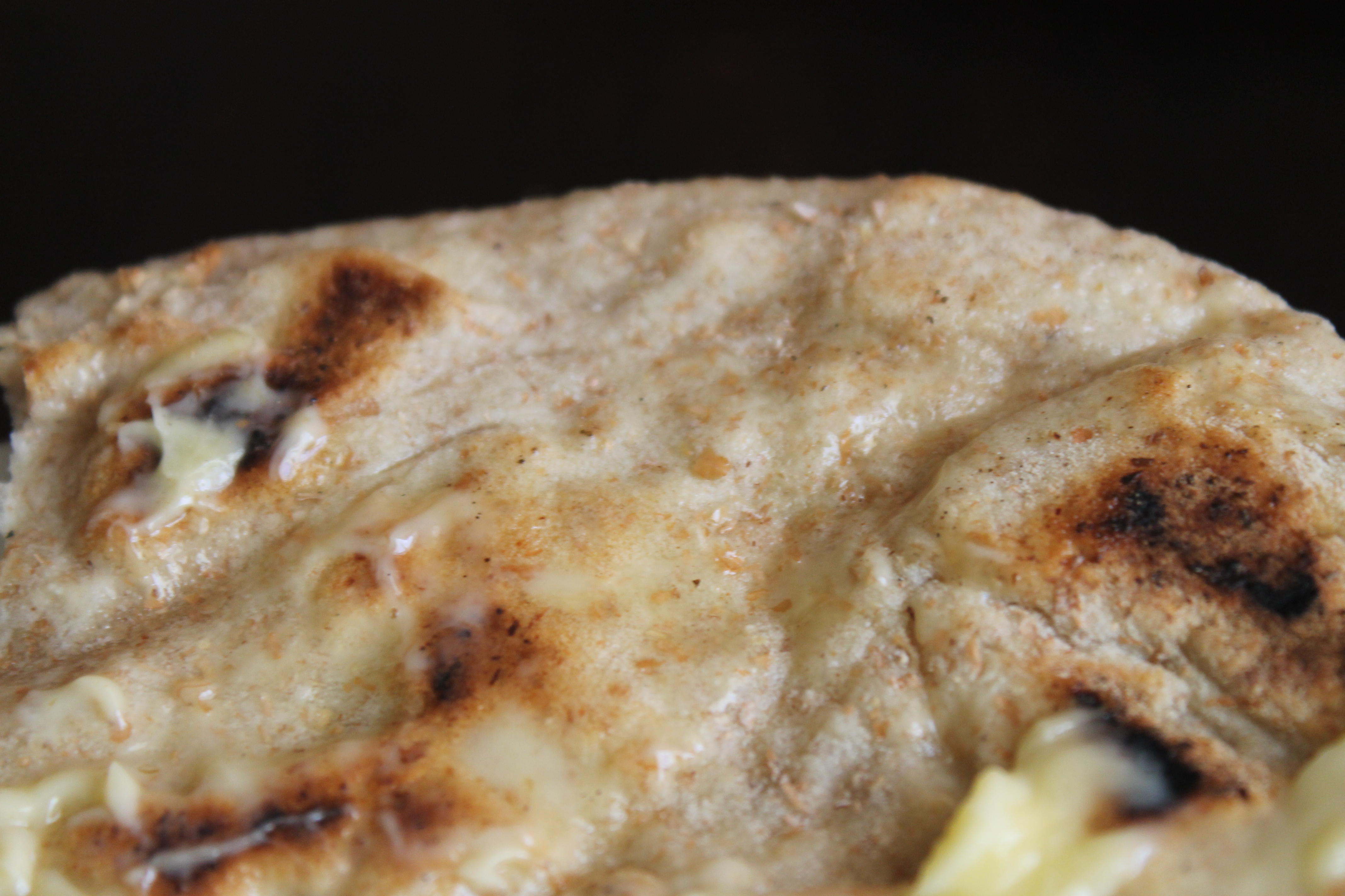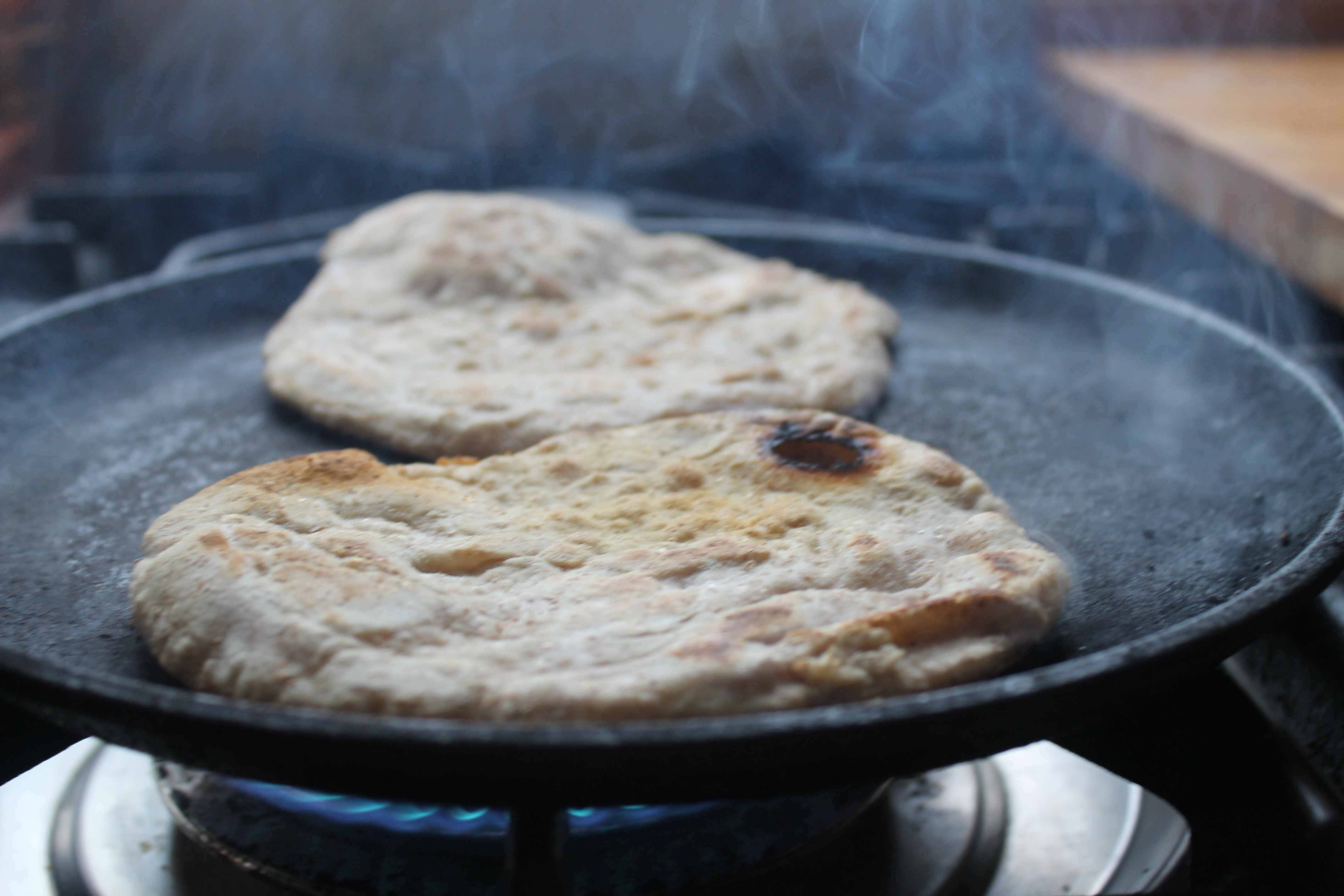 Svo hitaði ég þykkbotna pönnu vel, setti eina flatbrauðskökuna á hana og steikti hana við frekar háan hita. Líklegt er að gufuþrýstingurinn sem verður inni í deiginu þegar það hitnar myndi stórar loftbólur og ef maður vill ekki hafa kökurnar útblásnar er best að þrýsta oft ofan á þær með spaða til að pressa loftið út.
