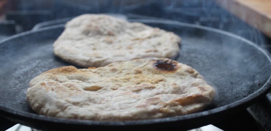 Ég hef oft áður talað um hvað það er þægilegt að eiga yfirleitt brauðdeig í krukku í ísskápnum. Oftast tek ég það út 30-60 mínútum áður en ég baka það og læt það volgna og lyfta sér dálítið áður en það fer í ofninn. En það er reynar ekki nauðsynlegt, ekki ef maður ætlar að baka flatbrauð. Eða öllu heldur steikja það á pönnu. Þá fer heldur enginn tími í að hita ofninn.