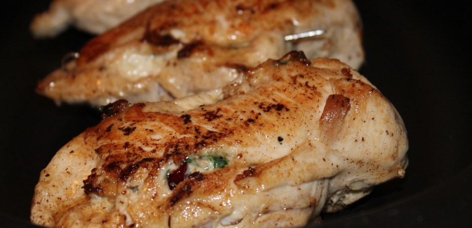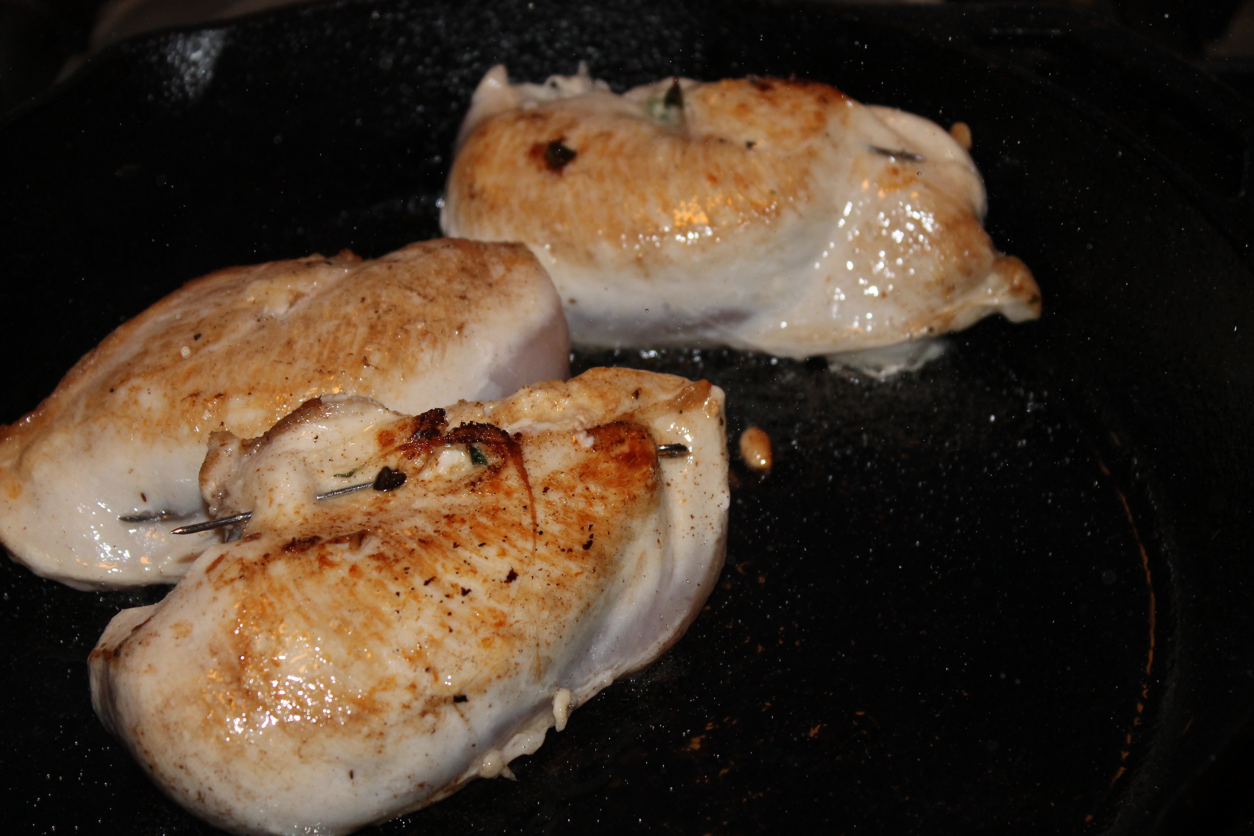 Ég hitaði svo ögn af olíu á pönnu og brúnaði bringurnar við góðan hita á báðum hliðum – eða eiginlega á þremur hliðum því svona troðnar og bústnar bringur eru ekkert með tvær flatar hliðar til að brúna, sko.