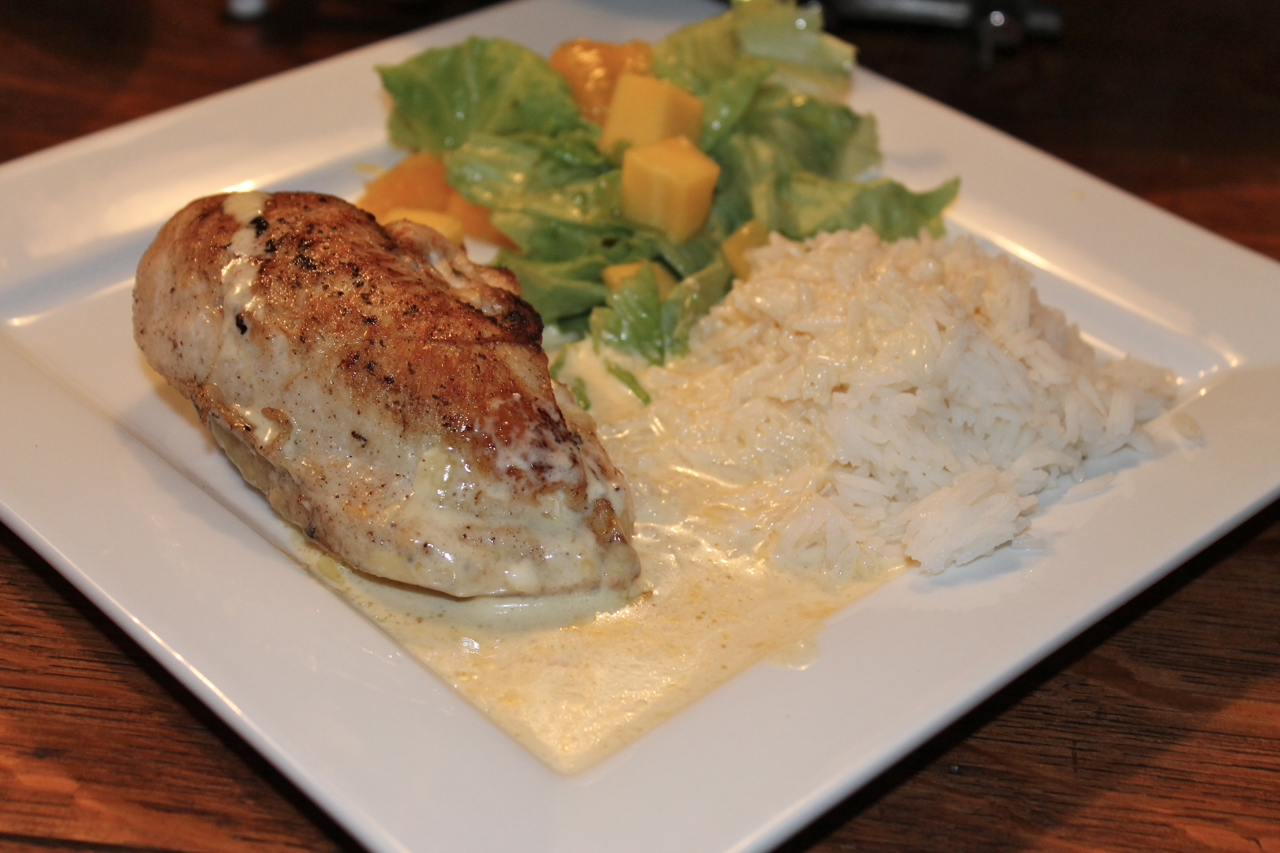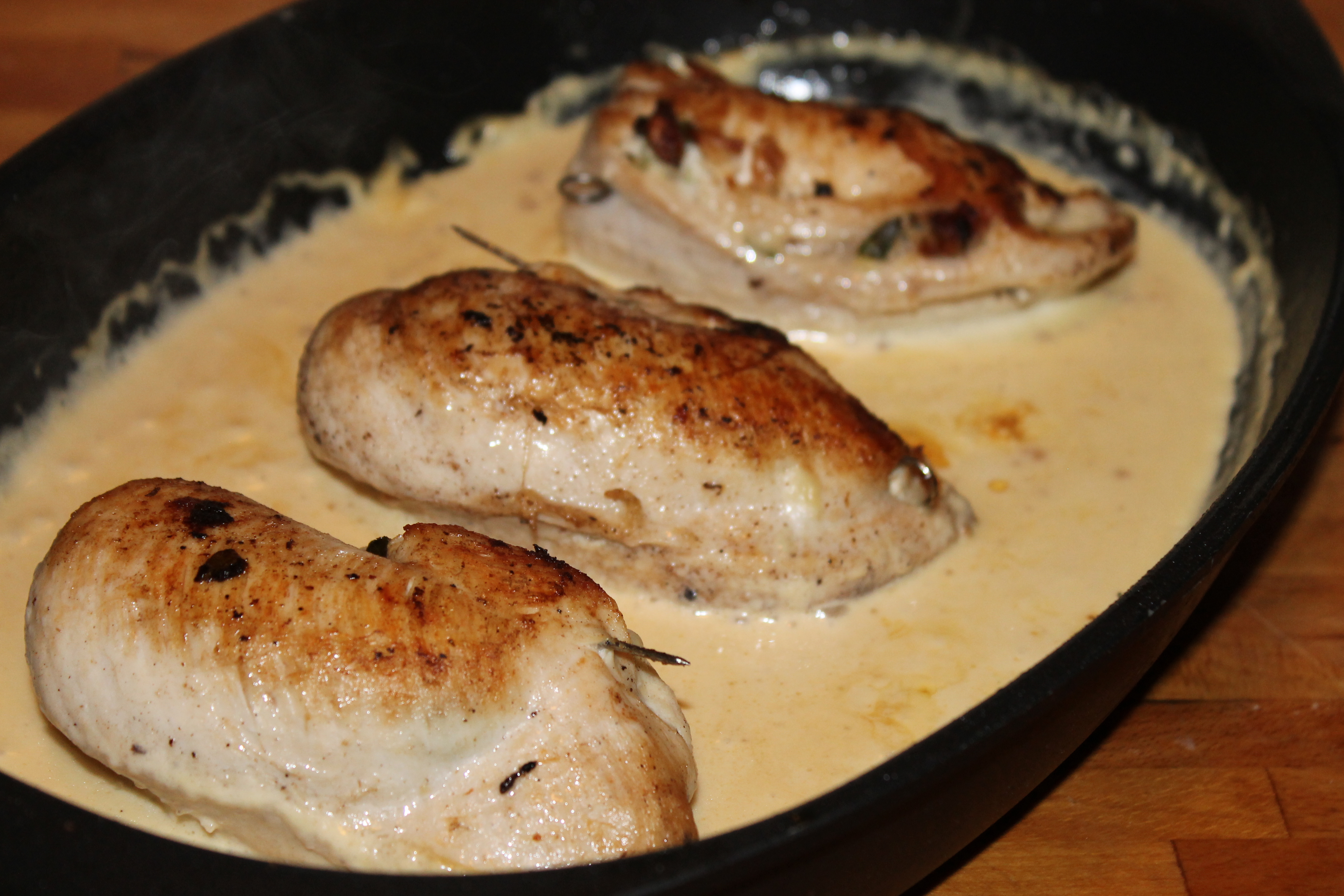 Þegar steikingartíminn var um það bil hálfnaður hellti ég 25o ml af rjóma í fatið til að gera sósu og steikti þetta svo áfram. Kryddaði rjómann með ögn af pipar og salti, þó ekki mikið því dálítið af fyllingunni rennur út í fatið og það kemur bragð úr henni.