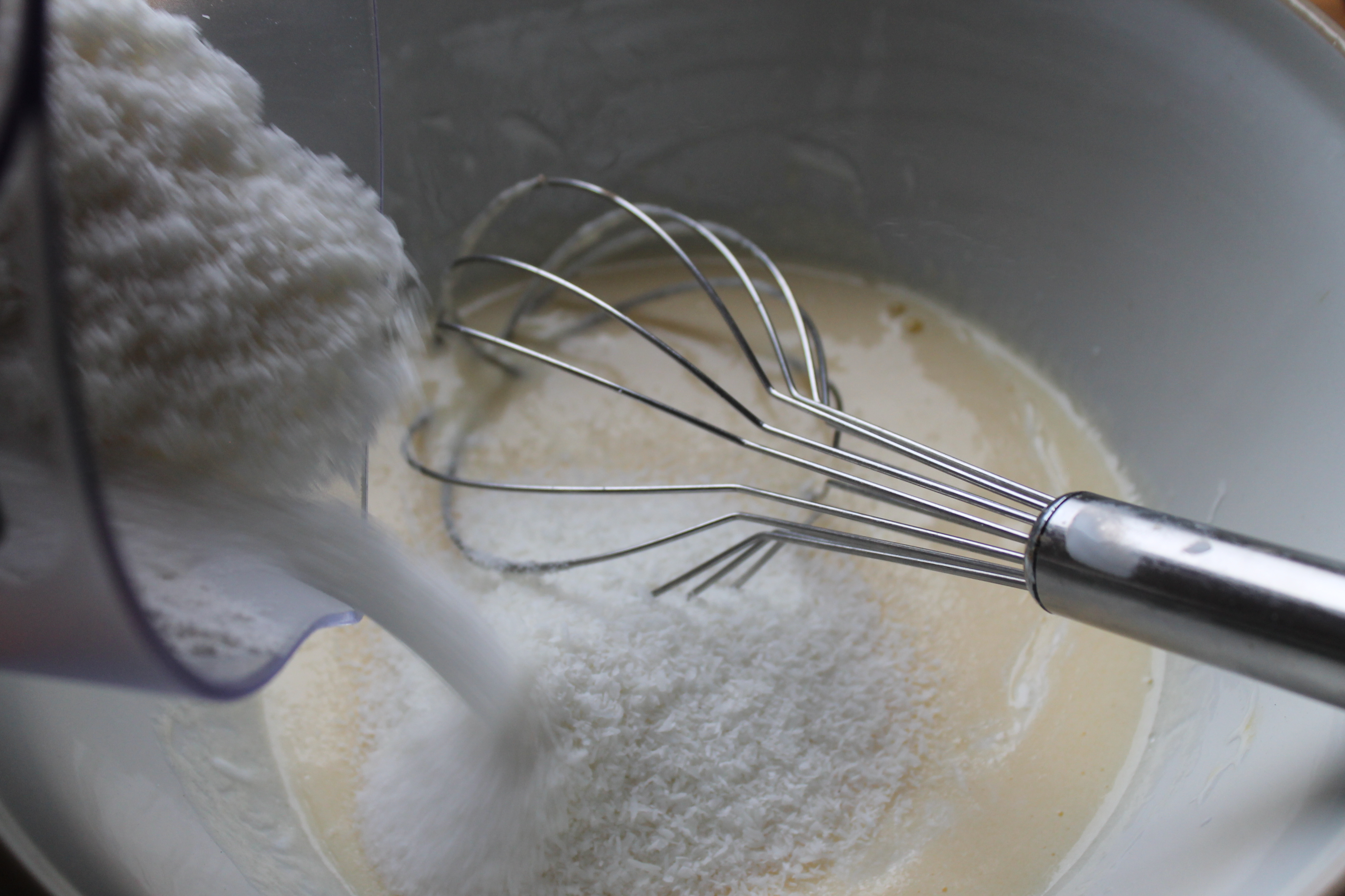 Mér fannst svo þegar ég var að hugsa þetta að kókos gæti passað vel með og þá þyrfti líklega ekki önnur bragðefni. Það reyndist rétt en það mætti alveg bæta ögn af annaðhvort vanillu eða rifnum sítrónuberki út í deigið, mér fannst það óþarfi.