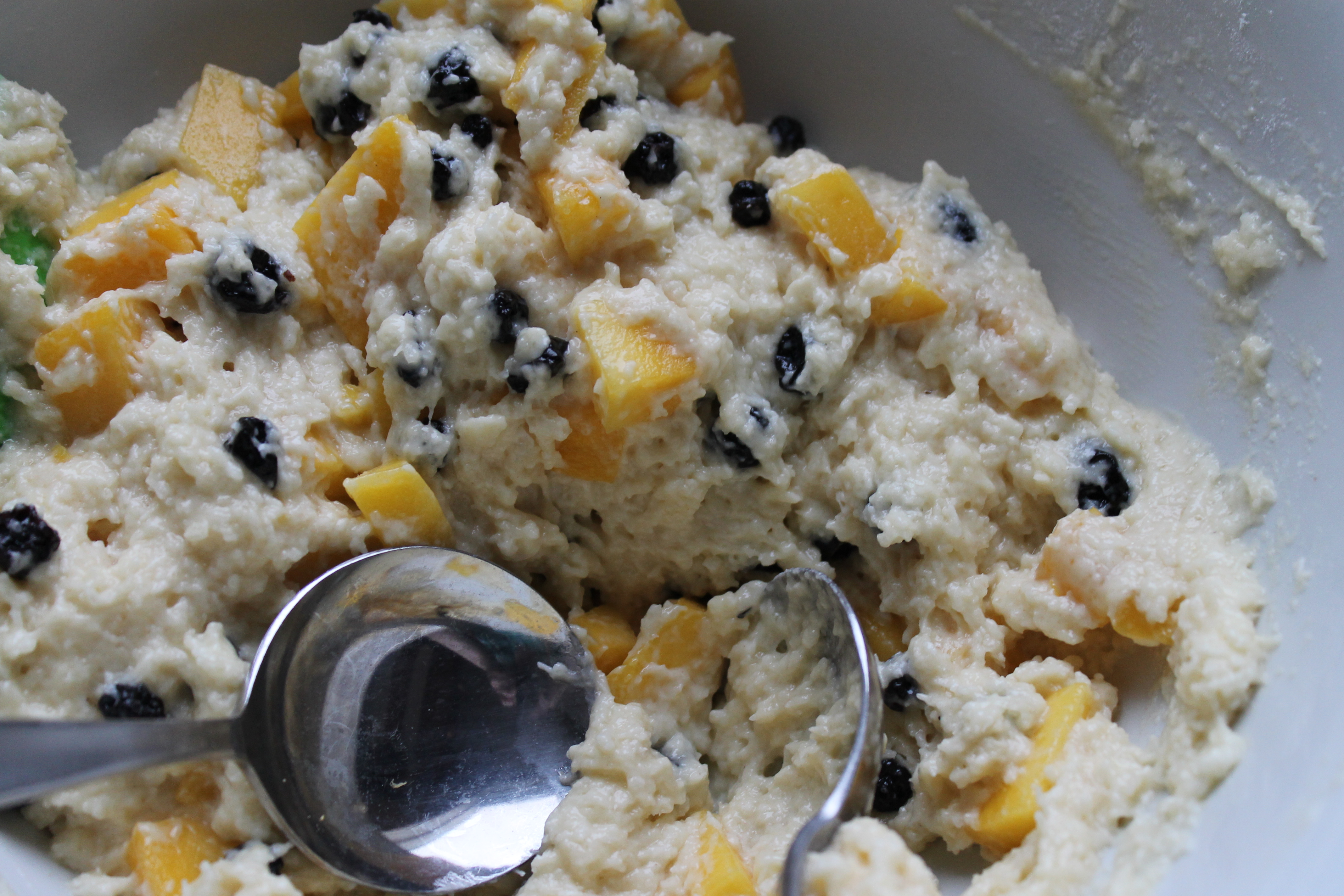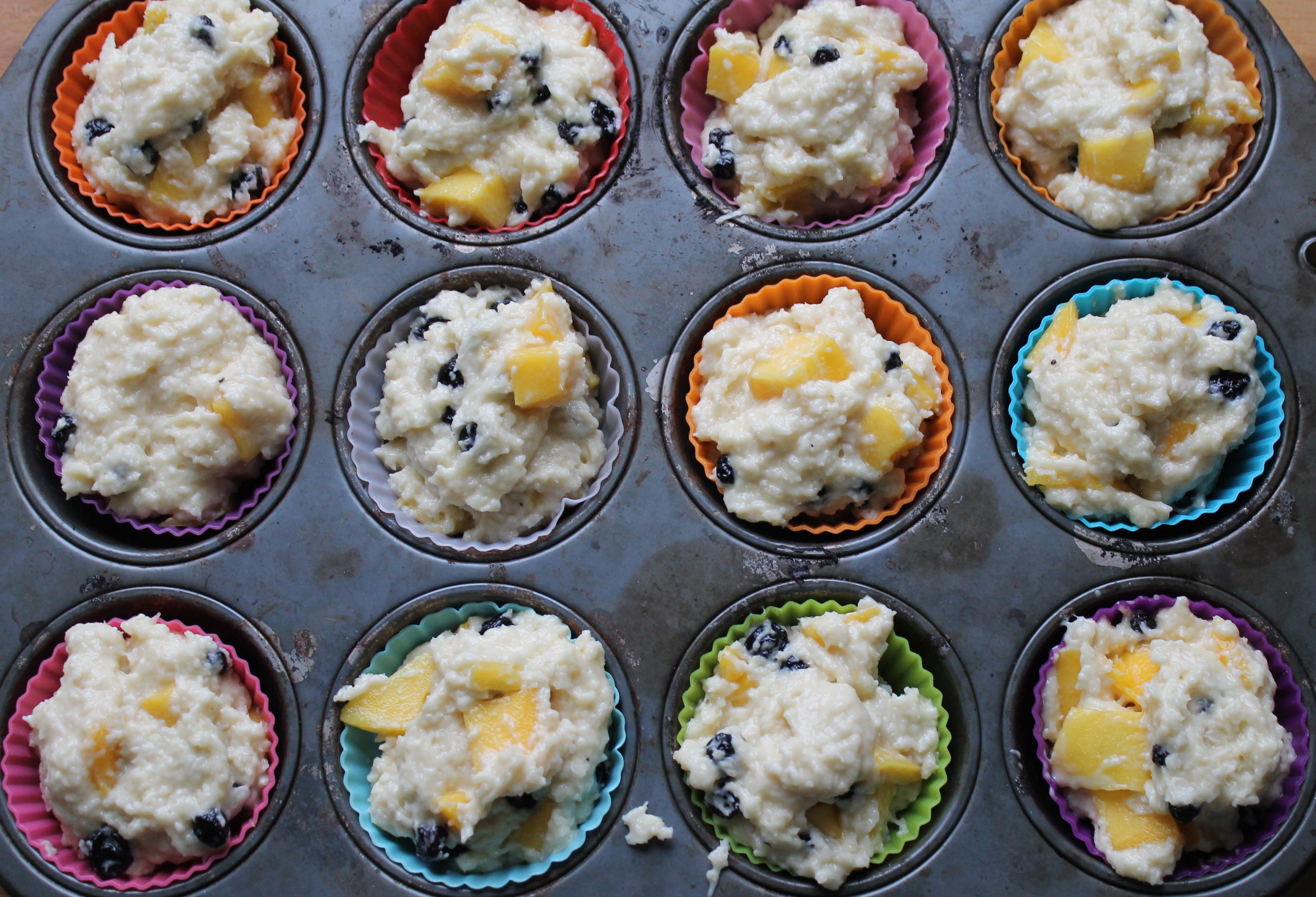 Ég blandaði mangóinu og berjunum saman við deigið með sleikjunni. Tók svo múffuform úr málmi og raðaði 12 silíkonformum í það (en það má alveg eins nota pappírsform til að klæða málmformið) og setti deigið í formin með tveimur matskeiðum.