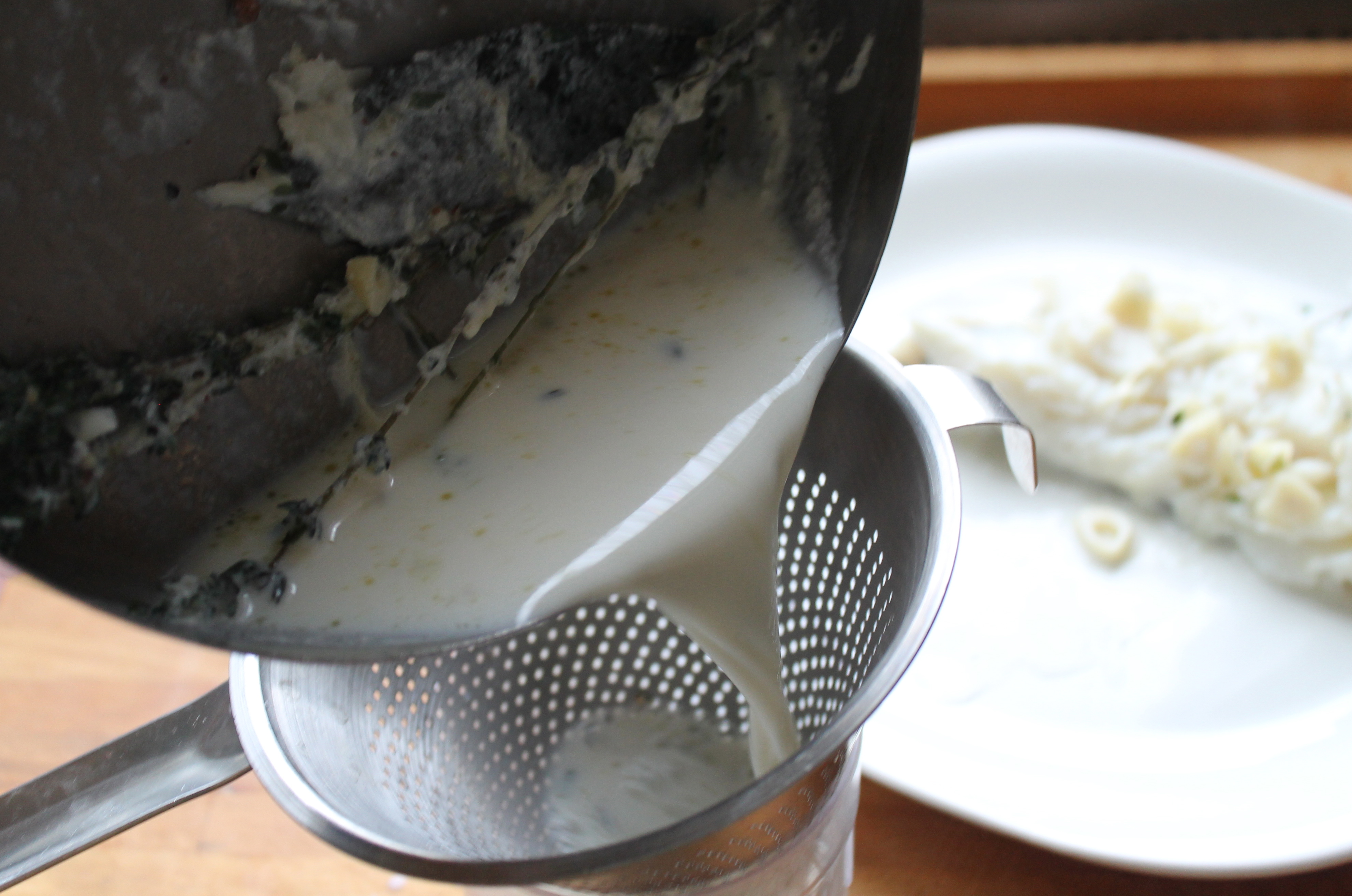 Ég athugaði svo hvort fiskurinn væri hæfilega soðinn, þ.e. hvort hann losnaði auðveldlega sundur í flögur – sem hann gerði – og tók hann þá upp úr með spaða og setti á disk. Ég veiddi líka þá hvítlauksbita sem ég sá upp úr og setti þá hjá fiskinum. Svo síaði ég mjólkursoðið og mældi það.