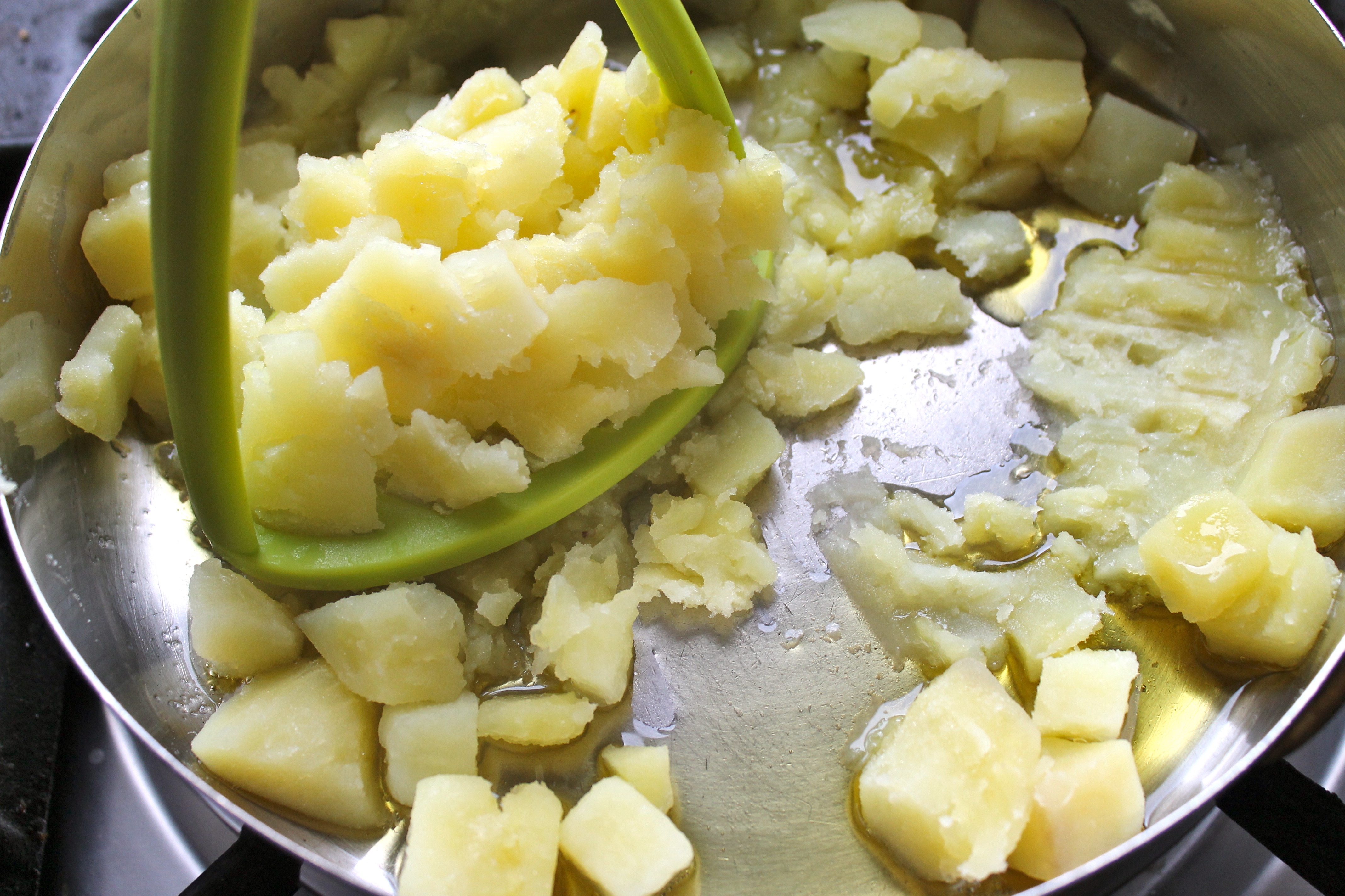 Ég flysjaði kartöfluna, skar hana í fremur litla teninga og sauð þá í potti þar til þeir voru meyrir. Hitaði á meðan ofninn í 220°C.