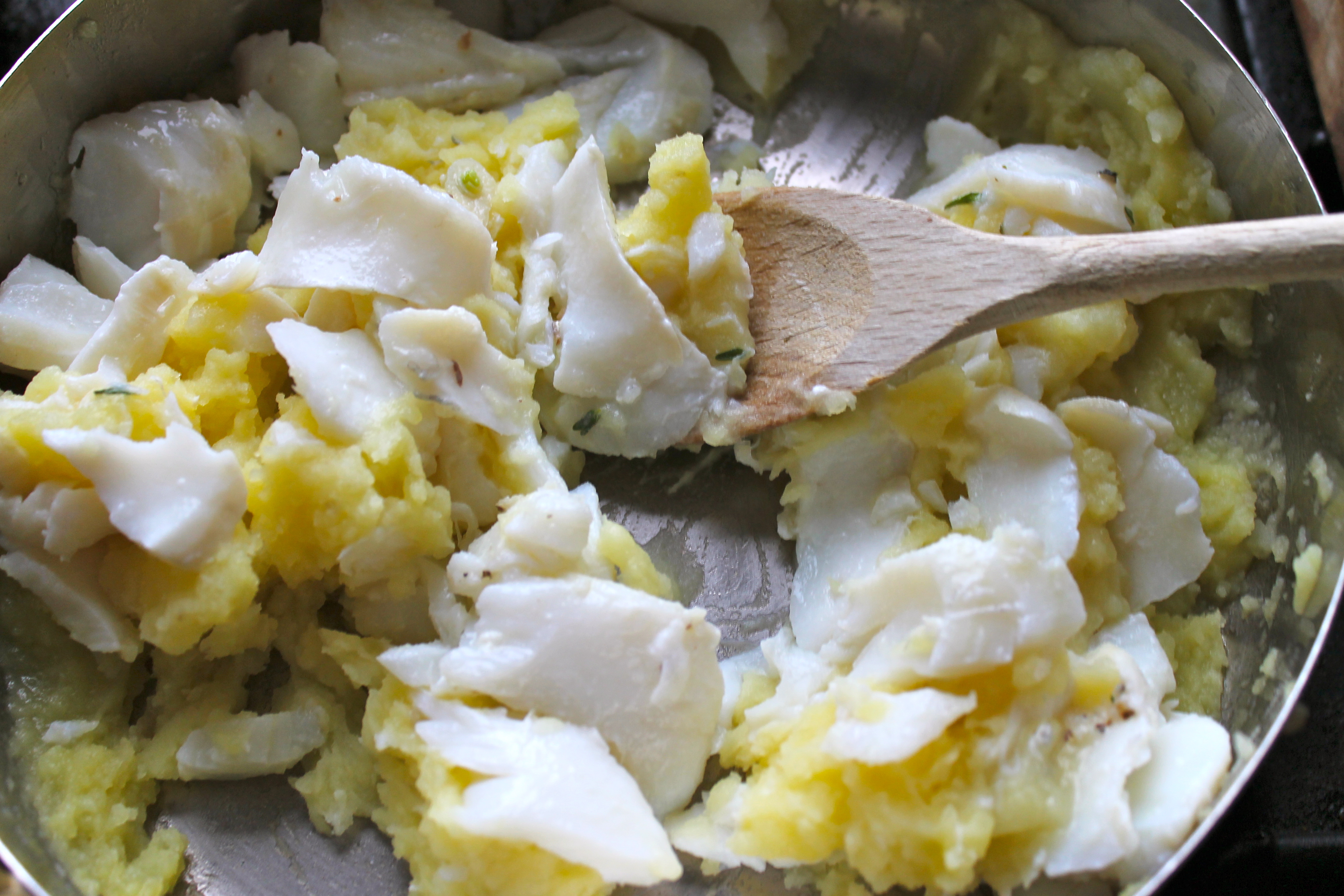 Ég roðfletti saltfiskinn, losaði hann sundur í flögur, setti hann út í og hrærði saman við með sleif. Ég vildi ekki hafa fiskinn fínstappaðan en auðvitað má gera það líka. Svo hrærði ég mjólkinni saman við smátt og smátt þar til plokkarinn var hæfilega þykkur – ætli ég hafi ekki notað helminginn af henni (100 ml). Smakkaði og bætti við pipar (þetta á helst að vera vel piprað) og svolitlu salti.