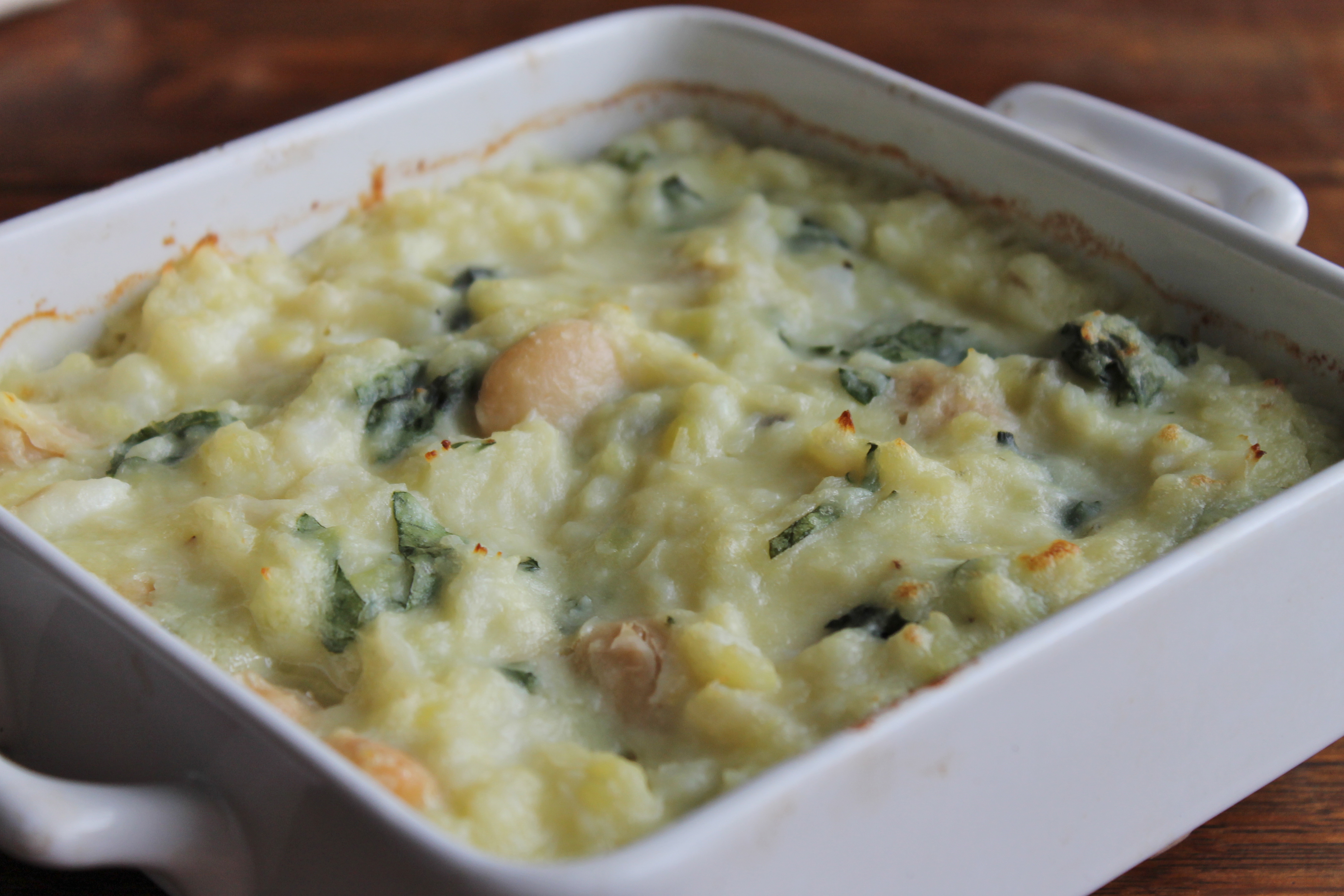Ég fann meðal annars mynd á minnir mig amerískri síðu af einhvers konar saltfiskplokkara; myndin var ekki af fullbúnum rétti, heldur var verið að hræra í jukkinu og ég sá að það voru smjörbaunir í þessu. – Hmm, það hefði mér ekki dottið í hug, gæti verið sniðugt, hugsaði ég. Prófaði bragðið í huganum og leist ekkert illa á. Svo að ég ákvað að gera gratíneraðan saltfiskplokk með smjörbaunum – átti einmitt nokkrar dósir í jarðskjálftabirgðunum.